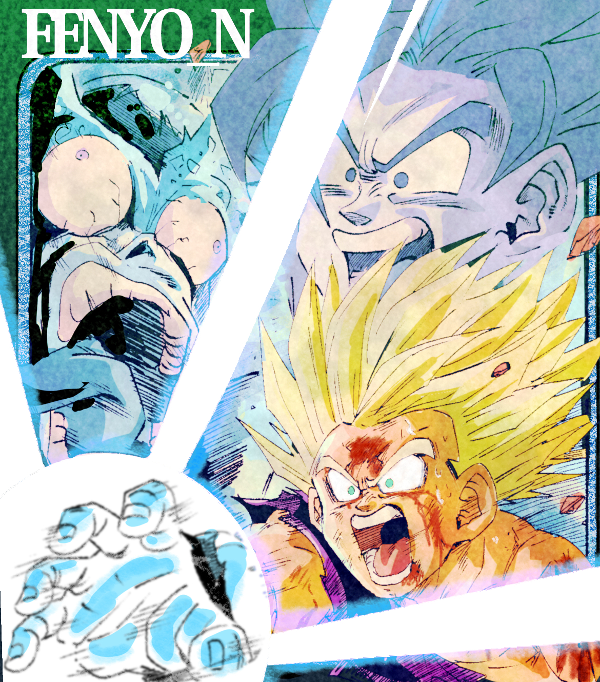 3boys aqua_eyes artist_name blonde_hair blood blood_on_face border bulging_eyes cell_(dragon_ball) debris dirty dirty_face dougi dragon_ball dragonball_z energy_blast father-son_kamehameha father_and_child father_and_son fenyon green_border highres kamehameha_(dragon_ball) male_focus multiple_boys muscular muscular_male open_mouth parent_and_child perfect_cell purple_eyes purple_shirt scene_reference scratches shirt short_hair single_bare_shoulder son_gohan son_goku spiked_hair super_saiyan super_saiyan_2 sweat tongue tongue_out torn_clothes wide-eyed wristband
