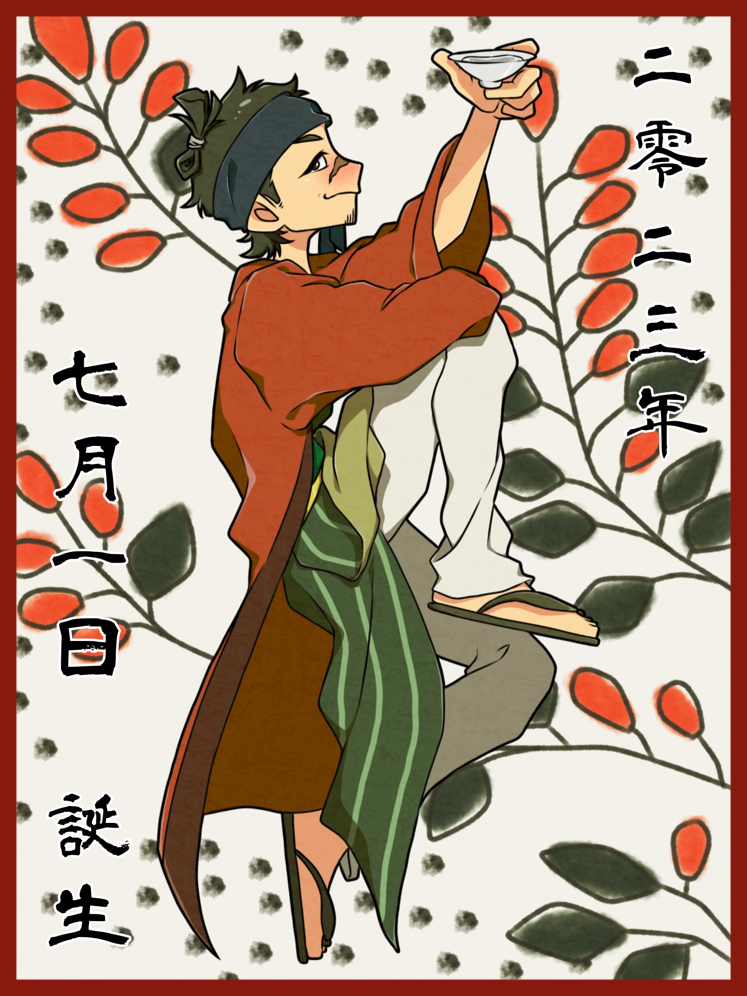 1boy arm_up beard_stubble border brown_hair card cup facial_hair flower headband highres holding holding_cup japanese_clothes kimono male_focus pants playing_card profile red_border red_kimono revenger sakazuki sandals scar scar_on_face scar_on_nose short_hair sisi07612 solo souji_(revenger) stubble wide_sleeves
