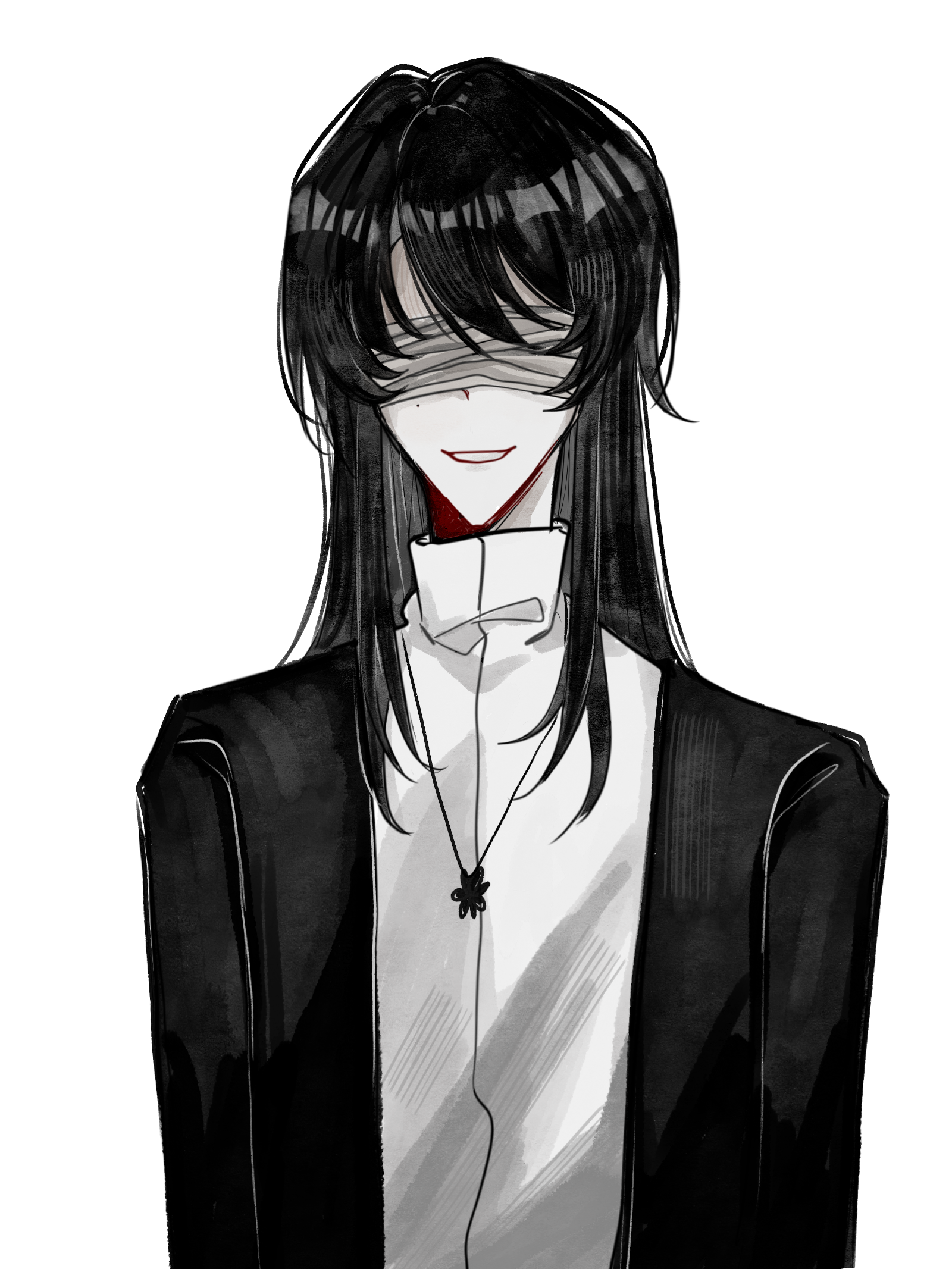 1boy baimi33 bandages bandages_over_eyes black_hair black_jacket chinese_commentary commentary_request facing_viewer high_collar highres jacket jewelry long_hair male_focus mei_liyang mole mole_under_eye necklace open_clothes open_jacket pale_skin shirt simple_background smile solo touqi_guaitan upper_body white_background white_shirt