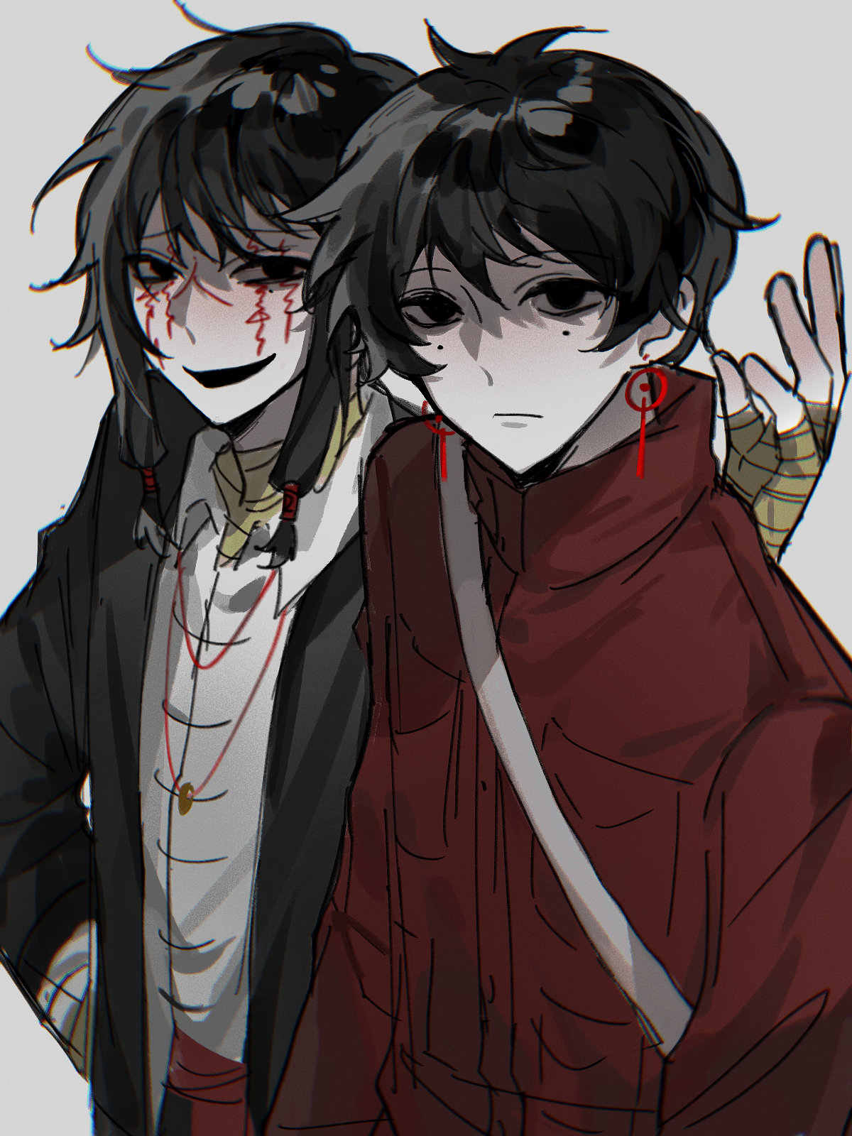 2boys black_eyes black_hair black_jacket chinese_commentary closed_mouth collared_shirt commentary_request earrings facial_tattoo grey_background hand_on_own_hip hand_up high_collar highres jacket jewelry li_yuting_(male) male_focus medium_hair mole mole_under_each_eye mole_under_eye multiple_boys multiple_moles necklace open_clothes open_jacket open_mouth qijilan red_jacket shirt short_hair simple_background smile tattoo touqi_guaitan white_shirt ziche_fuzhao