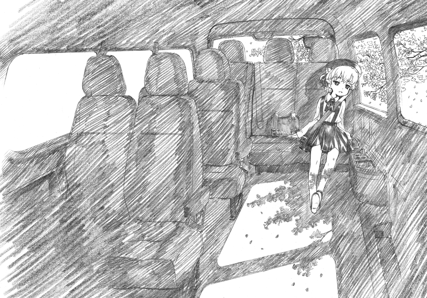 1girl beret collared_shirt commentary_request expressionless graphite_(medium) greyscale hat hatoba_tsugu looking_to_the_side monochrome nakamura_hirofumi shirt short_hair sitting sketch skirt solo suspender_skirt suspenders traditional_media tsugu_(vtuber) vehicle_interior virtual_youtuber