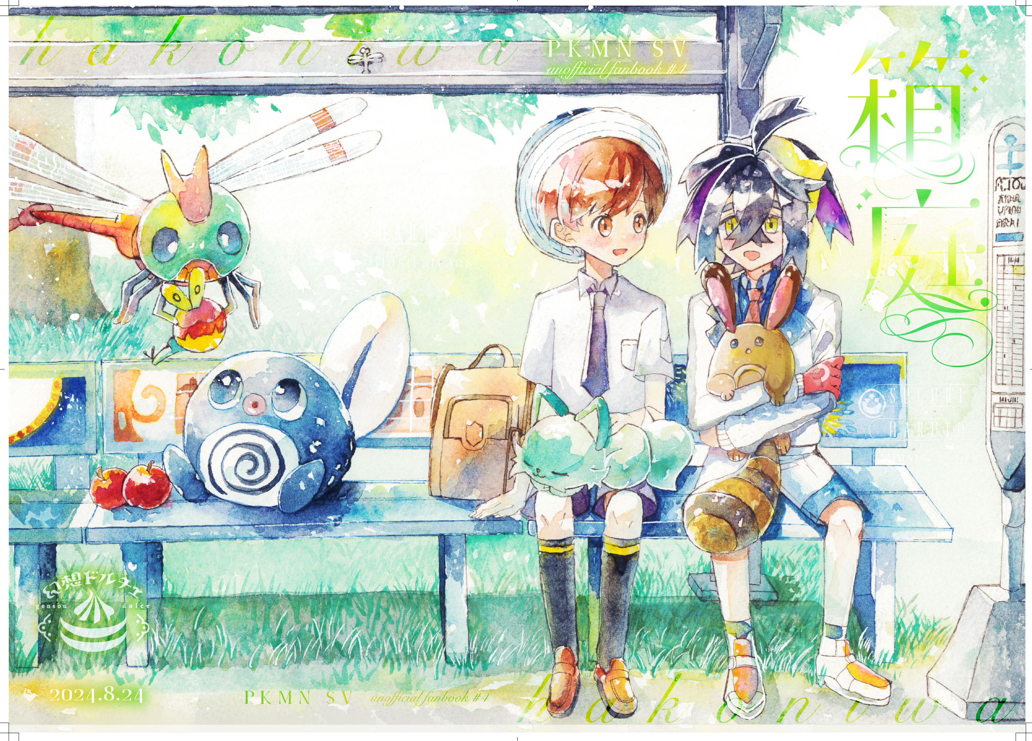 2boys apple backpack bag bench breast_pocket brown_eyes brown_footwear brown_hair collared_shirt commentary_request day fantasydolce florian_(pokemon) food fruit gen_1_pokemon gen_2_pokemon gloves grass hat highres jacket kieran_(pokemon) knees male_focus multiple_boys necktie nintendo open_mouth outdoors painting_(medium) pocket pokemon pokemon_(creature) pokemon_sv poliwag sentret shirt shoes short_hair short_sleeves shorts single_glove sitting smile socks sprigatito traditional_media unworn_backpack unworn_bag watercolor_(medium) white_jacket white_shorts yanma