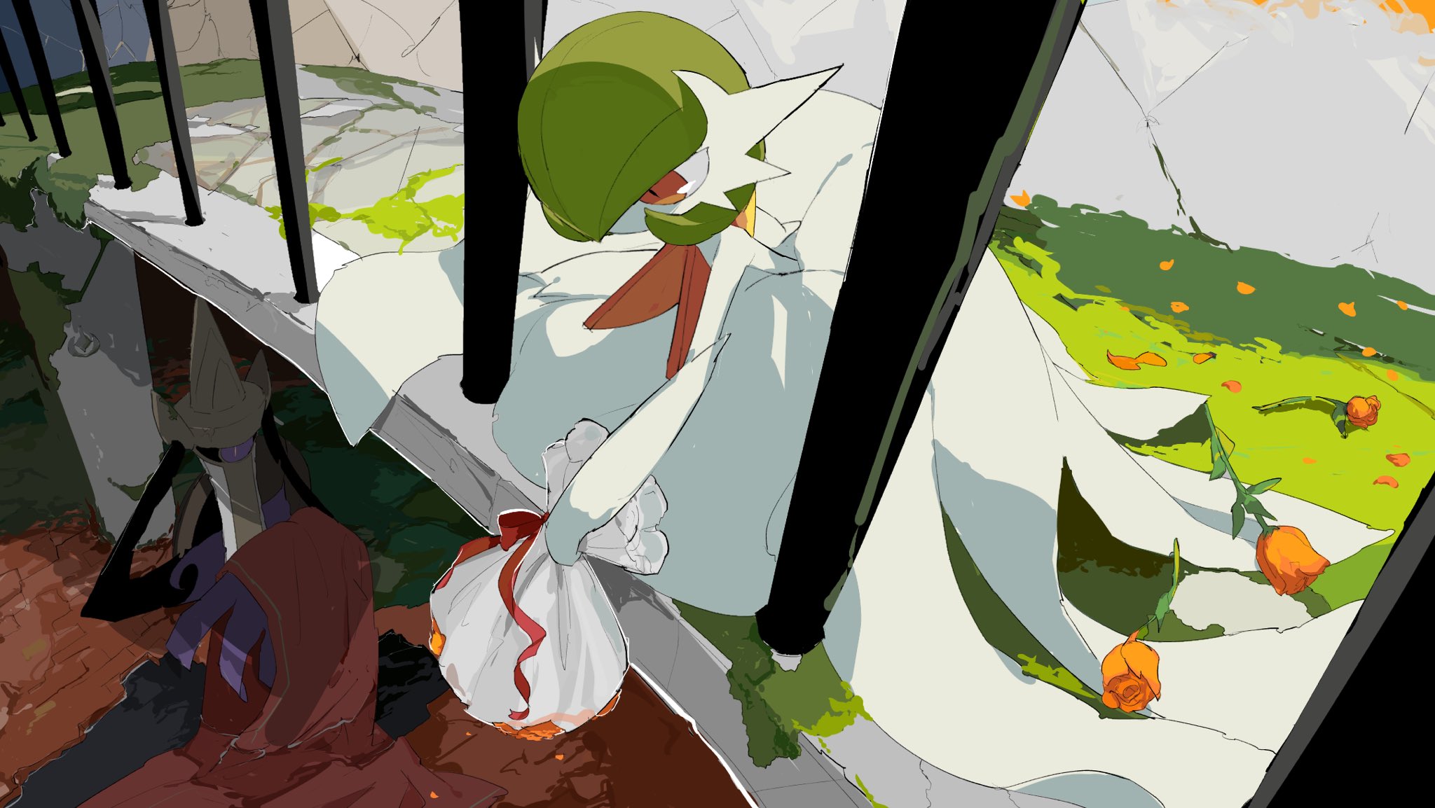 aegislash apios bad_id bad_twitter_id bob_cut colored_skin dress elbow_gloves flower gardevoir gen_3_pokemon gen_6_pokemon gloves green_hair hair_over_one_eye highres holding holding_shield mega_gardevoir mega_pokemon nintendo one-eyed orange_flower orange_rose pink_eyes pokemon pokemon_(creature) purple_eyes red_ribbon ribbon rose shield sword weapon white_dress white_gloves white_skin