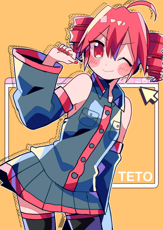 1girl ahoge blush_stickers character_name collared_shirt commentary cursor detached_sleeves drill_hair hand_up kasane_teto kasane_teto_(utau) long_sleeves looking_at_viewer nail_polish one_eye_closed pink_hair pleated_skirt red_eyes shirt skirt sleeveless sleeveless_shirt smile solo thighhighs twin_drills utau window_(computing) yellow_background yuusuke-kun