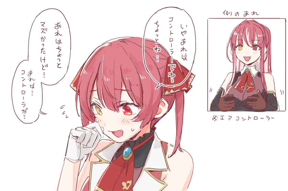 1girl a-ka black_leotard blush bodystocking breast_lift breasts cleavage commentary_request embarrassed fang gold_trim hair_ribbon heterochromia hololive houshou_marine houshou_marine_(1st_costume) houshou_marine_(marching_band) jacket large_breasts leotard long_hair medium_hair multiple_views official_alternate_costume open_mouth red_eyes red_hair red_jacket red_ribbon ribbon see-through_clothes see-through_cleavage sleeveless sleeveless_jacket sweatdrop translation_request twintails virtual_youtuber