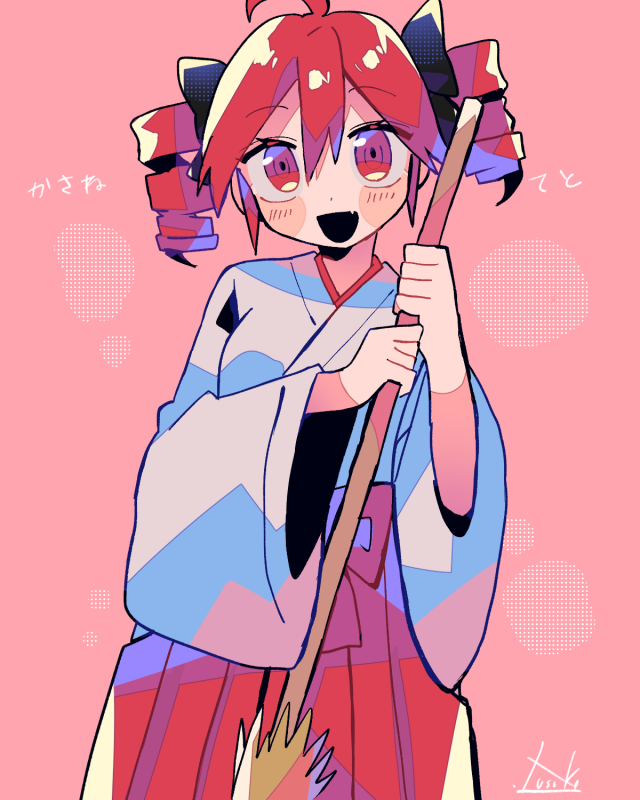1girl ahoge black_mouth blush_stickers bow broom commentary drill_hair fang hair_bow hakama hakama_skirt holding holding_broom japanese_clothes kasane_teto long_sleeves looking_at_viewer miko open_mouth pink_background red_eyes red_hair skirt smile solo translated twin_drills utau yuusuke-kun