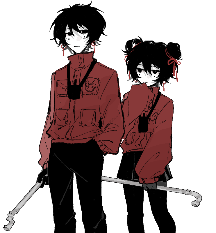 1boy 1girl bbaici black_eyes black_gloves black_hair black_pants black_pantyhose black_skirt camera camera_around_neck chinese_commentary closed_mouth colored_skin commentary_request dual_persona earrings gloves hair_between_eyes hair_bun hair_ribbon hair_rings hand_in_pocket height_difference high_collar holding holding_lead_pipe jacket jewelry lead_pipe li_yuting_(female) li_yuting_(male) long_sleeves miniskirt mole mole_under_each_eye mole_under_eye multiple_moles pants pantyhose pleated_skirt red_jacket red_ribbon ribbon short_hair simple_background single_hair_bun single_hair_ring single_sleeve_past_fingers skirt touqi_guaitan white_background white_skin