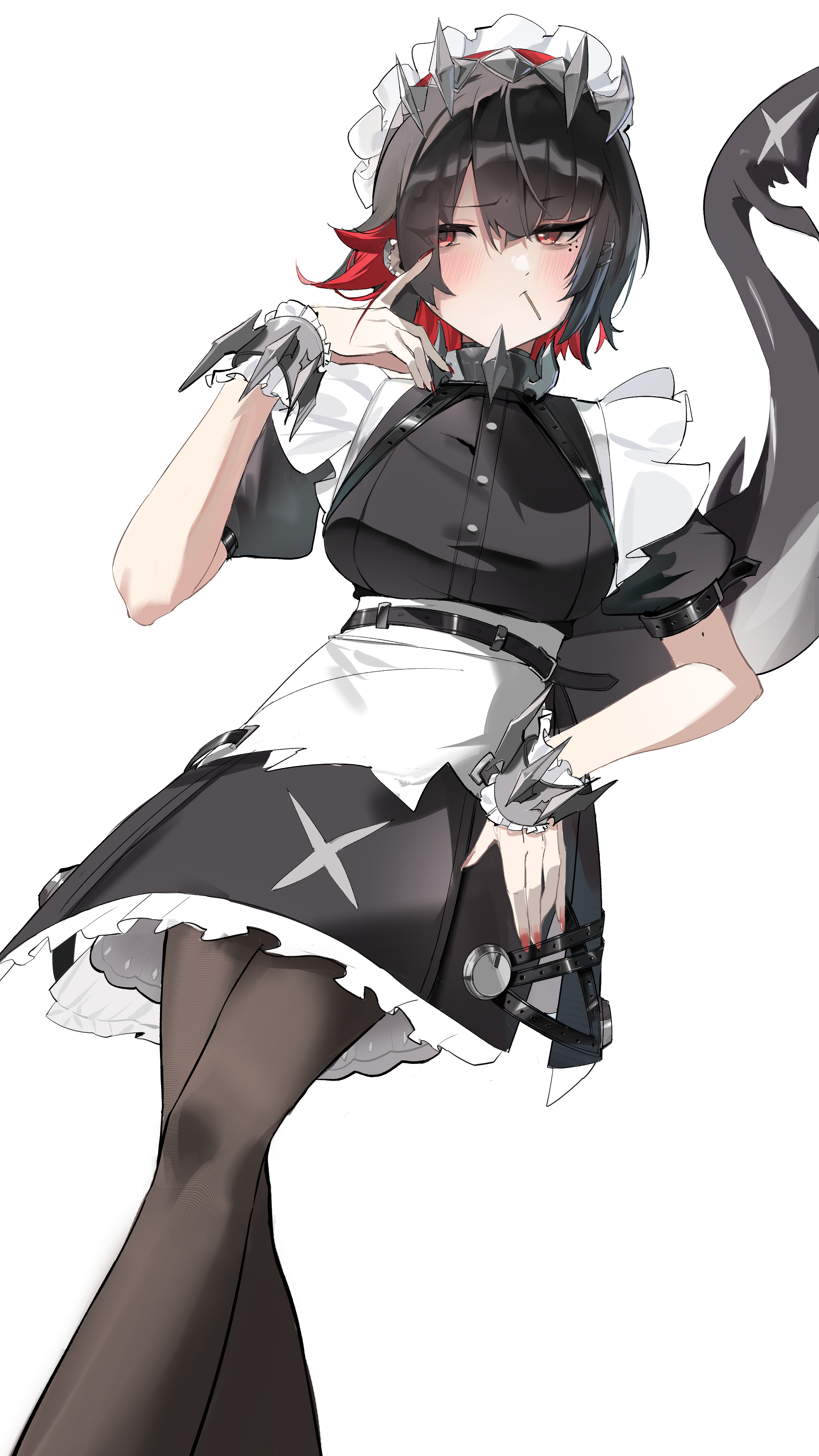 1girl absurdres akihoop black_hair breasts candy colored_inner_hair dress ellen_joe fins fish_tail food frilled_wristband hairband highres holding holding_candy holding_food holding_lollipop large_breasts lollipop looking_at_viewer maid maid_headdress metal_hairband mole mole_under_eye mouth_hold multicolored_hair pantyhose red_eyes red_hair red_nails shark_girl shark_tail short_hair simple_background solo spiked_headband tail two-tone_hair zenless_zone_zero