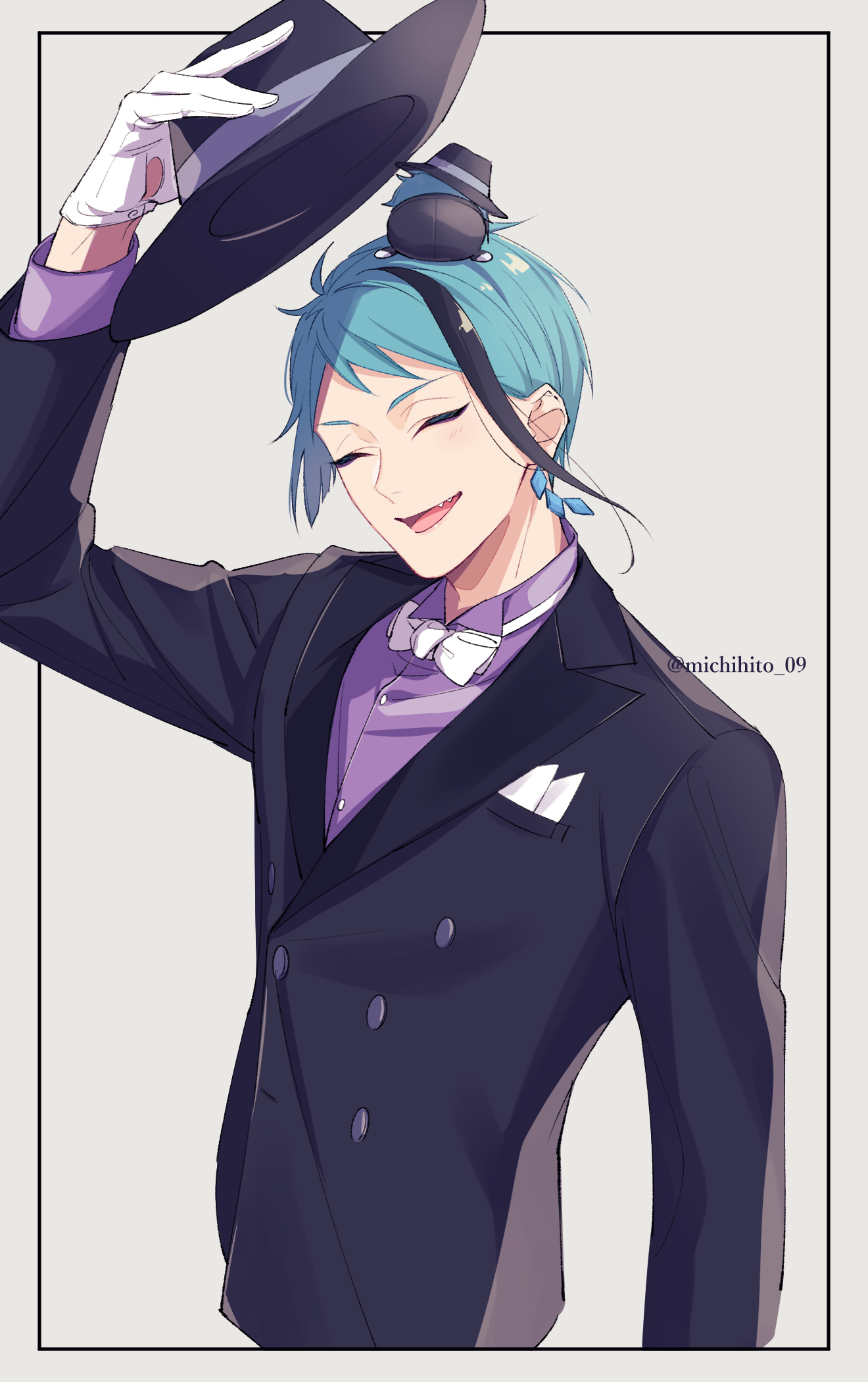 1boy black_suit blue_hair bow bowtie character_doll closed_eyes cropped_torso disney_tsum-tsum doll floyd_leech formal_clothes gloves grey_background highres jade_leech male_focus michihito short_hair simple_background solo suit tsum-tsum twisted_wonderland upper_body white_gloves