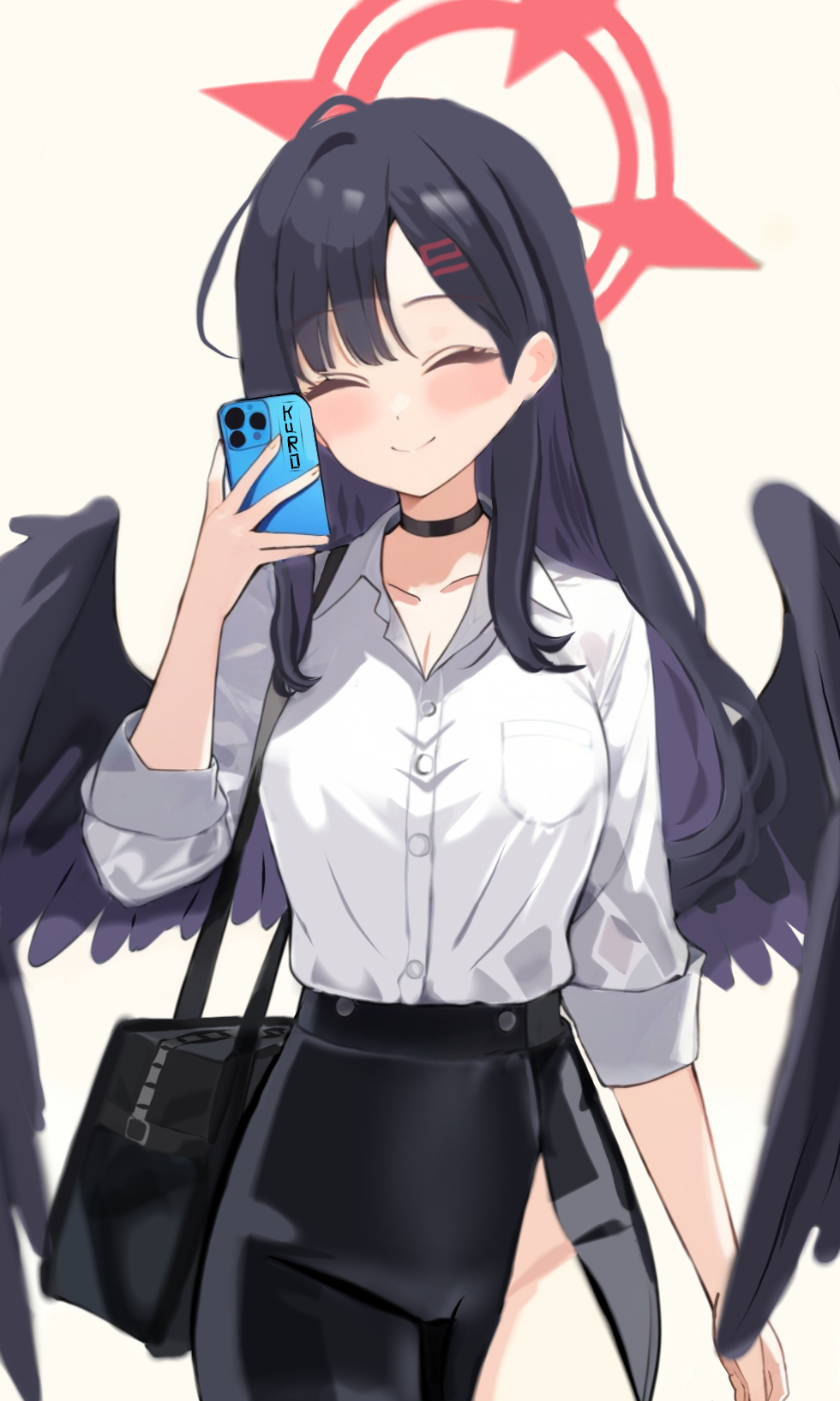 1girl black_bag black_choker black_skirt black_wings blue_archive blush cellphone choker closed_eyes closed_mouth collared_shirt commentary facing_viewer feathered_wings formal_clothes hair_ornament hairclip halo highres holding holding_phone ichika_(blue_archive) kurogami_fuyuki low_wings office_lady phone red_halo revision safety_pin shirt simple_background skirt skirt_suit smartphone smile solo suit white_background white_shirt wings