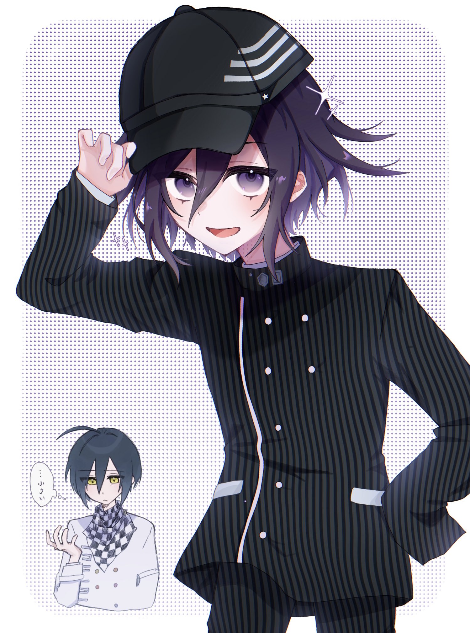 2boys :d ahoge black_hair black_hat black_jacket black_pants buttons checkered_neckerchief cosplay costume_switch danganronpa_(series) danganronpa_v3:_killing_harmony double-breasted hand_up hat highres jacket long_sleeves male_focus mashiro_(nq4l_r0) multiple_boys neckerchief oma_kokichi oma_kokichi_(cosplay) open_mouth pants purple_eyes purple_hair saihara_shuichi saihara_shuichi_(cosplay) short_hair smile speech_bubble striped_clothes striped_jacket striped_pants thought_bubble white_background white_jacket yellow_eyes