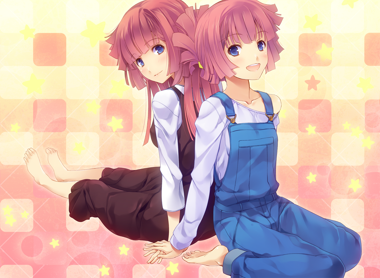 10s 2girls back-to-back barefoot blue_eyes feet highres holding_hands looking_at_viewer looking_back matsukawa_(pale_scarlet) multiple_girls off_shoulder open_mouth overalls pink_hair short_hair siblings sisters sitting star_(symbol) star_driver you_marino you_mizuno