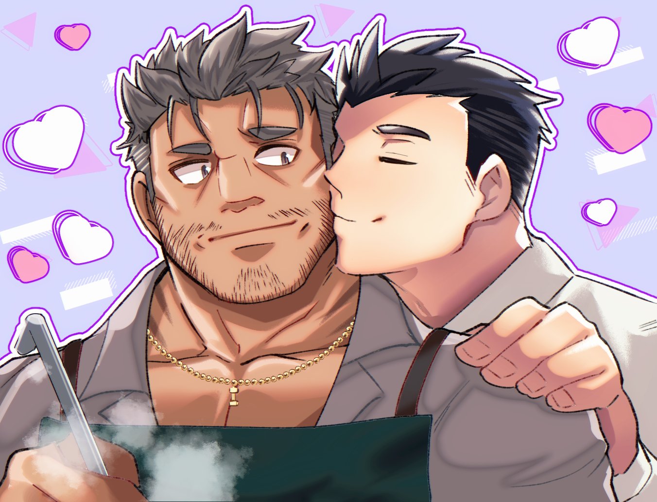 2boys closed_eyes dagon_(housamo) facial_hair heart jewelry looking_to_the_side male_focus multiple_boys necklace protagonist_3_(housamo) ramusyutarou tagme thick_eyebrows tokyo_houkago_summoners yaoi