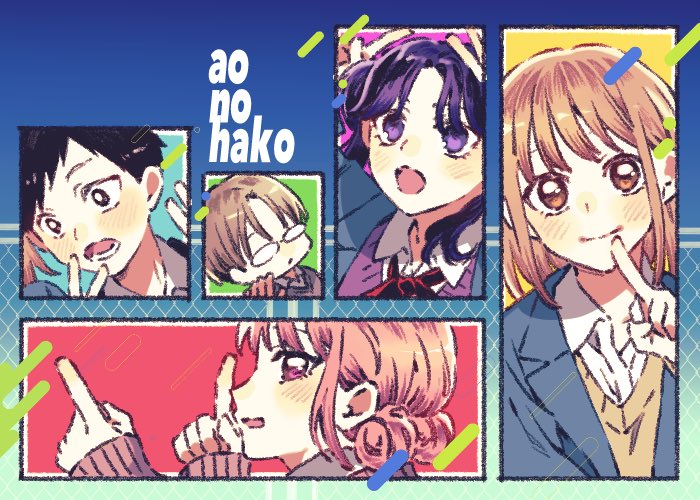 2boys 3girls ao_no_hako black_hair brown_eyes brown_hair brown_sweater_vest character_request chouno_hina closed_mouth collage collared_shirt copyright_name double_bun finger_to_mouth glasses grey_jacket hair_bun hand_up hashtag-only_commentary holding_hands index_finger_raised inomata_taiki jacket kano_chinatsu kasahara_kyou light_smile long_sleeves looking_at_viewer moriya_ayame multiple_boys multiple_girls open_mouth pink_eyes pink_hair purple_eyes purple_hair school_uniform shirt short_hair sweater_vest tere_douga upper_body very_short_hair white_shirt