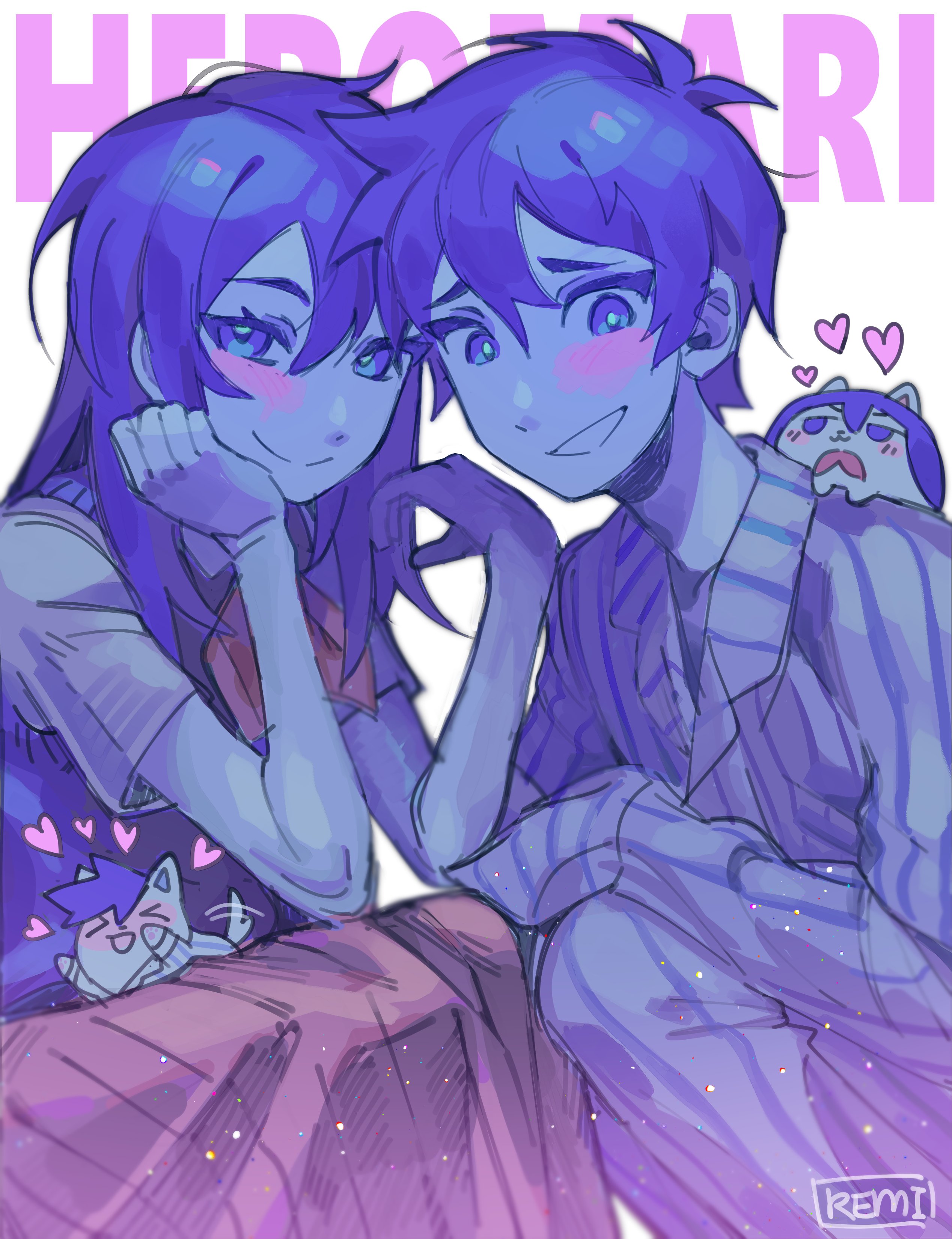 1boy 1girl absurdres animal antenna_hair blue_pajamas blue_pants blue_shirt blush brown_skirt cat closed_mouth collarbone collared_shirt colored_skin dog elbows_on_knees english_text feet_out_of_frame grin hair_between_eyes hand_on_own_cheek hand_on_own_face hands_up heart hero_(headspace)_(omori) hero_(omori) highres knees_up light_particles long_hair long_skirt long_sleeves looking_at_viewer mari_(headspace)_(omori) mari_(omori) neckerchief omori pajamas pants purple_eyes purple_hair purple_sweater_vest red_neckerchief remi_(mozzaremi) shirt short_hair short_sleeves signature simple_background sitting skirt smile striped_clothes striped_pajamas striped_pants striped_shirt sweater_vest vertical-striped_clothes vertical-striped_pajamas vertical-striped_pants vertical-striped_shirt white_background white_pajamas white_pants white_shirt white_skin