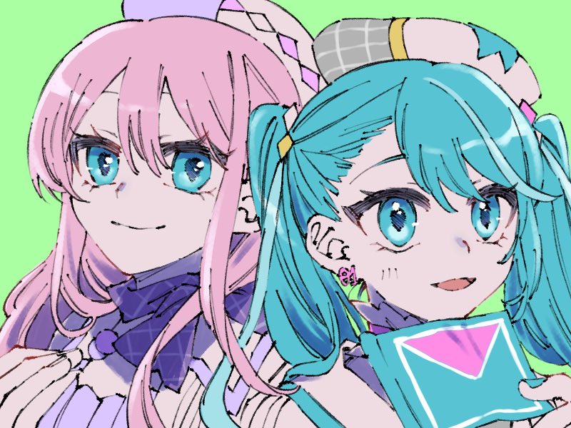 2girls alternate_costume aqua_eyes aqua_hair beret closed_mouth commentary earrings green_background hair_between_eyes hat hatsune_miku holding jewelry long_hair looking_at_viewer magical_mirai_(vocaloid) magical_mirai_luka magical_mirai_luka_(2024) magical_mirai_miku magical_mirai_miku_(2024) megurine_luka multiple_girls open_mouth pink_hair purple_scarf scarf smile tere_douga twintails vocaloid