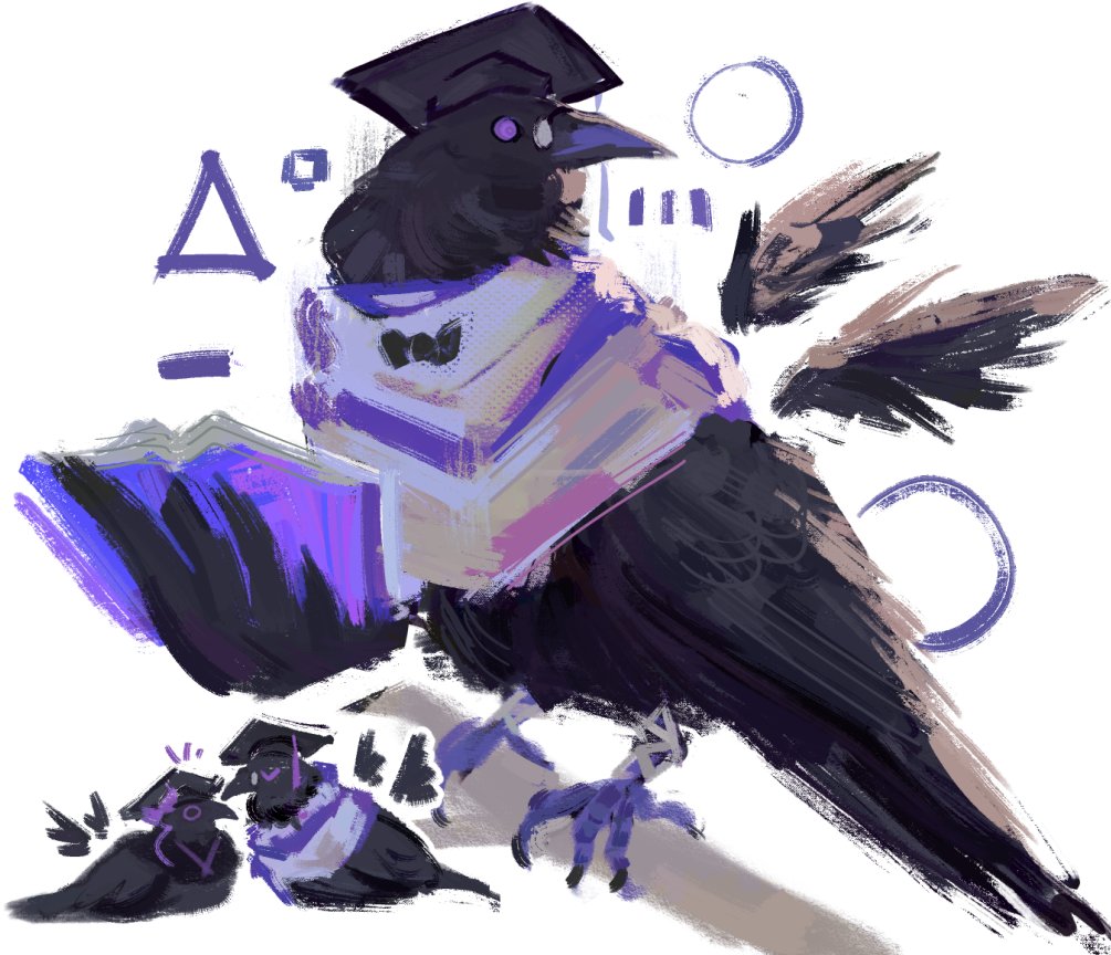 animal animal_focus bird book brush_stroke capelet clothed_animal commentary crow effie_(kerberosun) english_commentary full_body glasses hat holding holding_book mortarboard no_humans pince-nez purple_capelet purple_eyes rabbit_and_steel saya_the_archon_crow simple_background twili_the_valedictorian_crow white_background