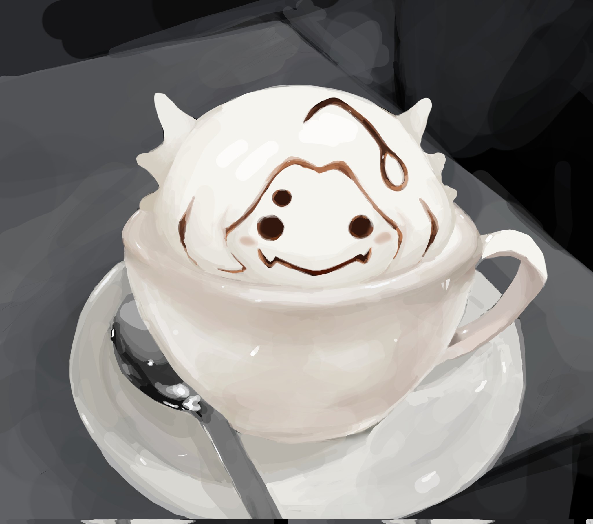 anglerfish cappuccino commentary corrupted_twitter_file cup fish foam food food_art food_focus highres kuhlabmeng37197 no_humans plate pressure_(roblox) realistic roblox sebastian_solace table teacup teaspoon