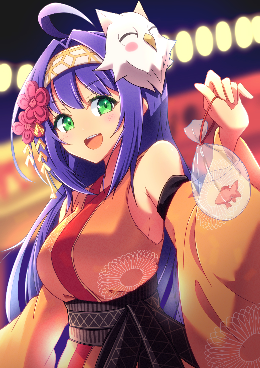 1girl :d ahoge bag bagged_fish bare_shoulders blurry blurry_background blush breasts character_mask detached_sleeves feh_(fire_emblem_heroes) fire_emblem fire_emblem:_path_of_radiance fire_emblem_heroes fish green_eyes hairband highres japanese_clothes kimono long_hair long_sleeves looking_at_viewer mask mask_on_head mia_(fire_emblem) mia_(yukata)_(fire_emblem) minamonochaba nintendo official_alternate_costume open_mouth orange_kimono purple_hair smile teeth upper_body upper_teeth_only yukata