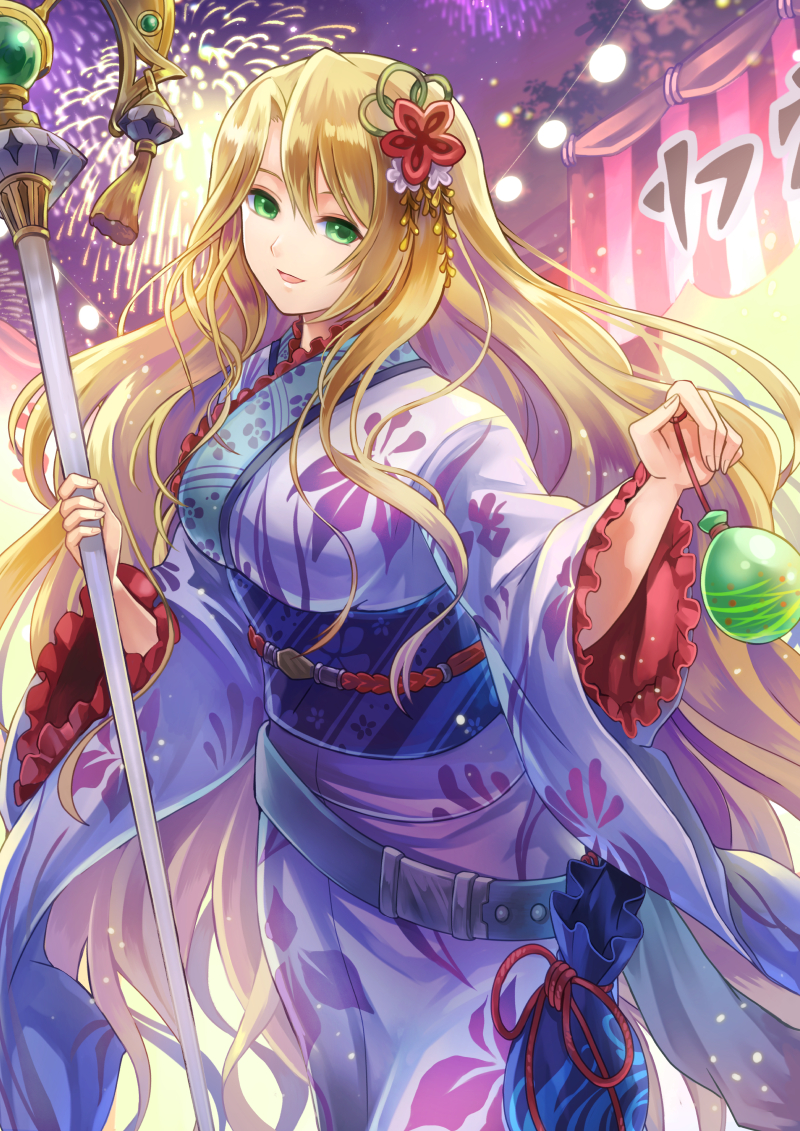 1girl akuru_(akr369akr) alternate_costume blonde_hair breasts commentary_request commission fire_emblem fire_emblem:_the_blazing_blade fire_emblem_heroes fireworks floral_print floral_print_kimono green_eyes hair_ornament holding holding_staff holding_weapon japanese_clothes kimono long_hair medium_breasts night nintendo obi open_mouth outdoors print_kimono purple_kimono saint_elimine_(fire_emblem) sash skeb_commission smile solo staff very_long_hair weapon wide_sleeves yukata