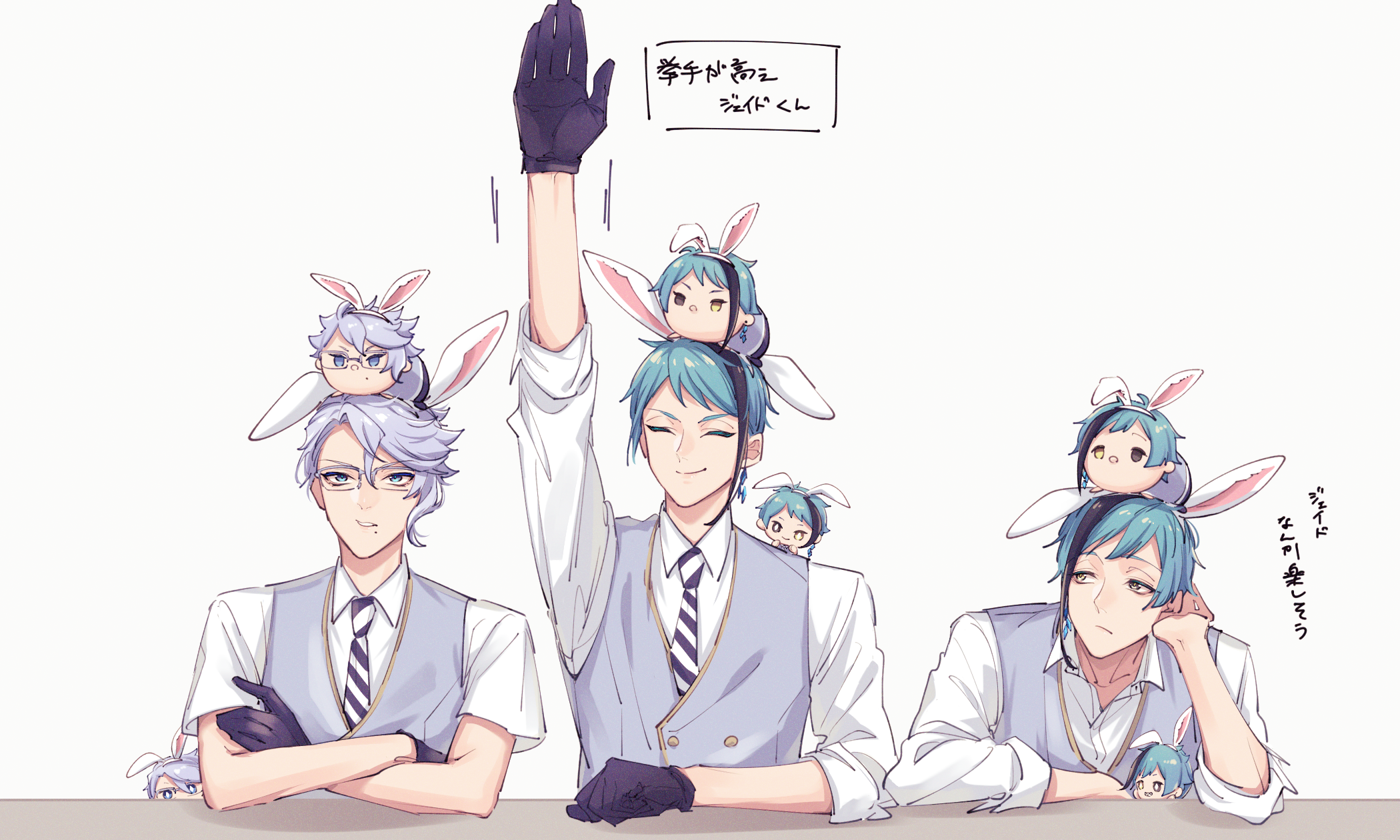 3boys arm_up azul_ashengrotto blue_eyes blue_hair brown_eyes character_doll closed_eyes crossed_arms disney_tsum-tsum doll floyd_leech grey_vest heterochromia highres jade_leech looking_at_another male_focus michihito multiple_boys purple_hair shirt short_hair simple_background smile table translation_request tsum-tsum twisted_wonderland upper_body vest white_background yellow_eyes