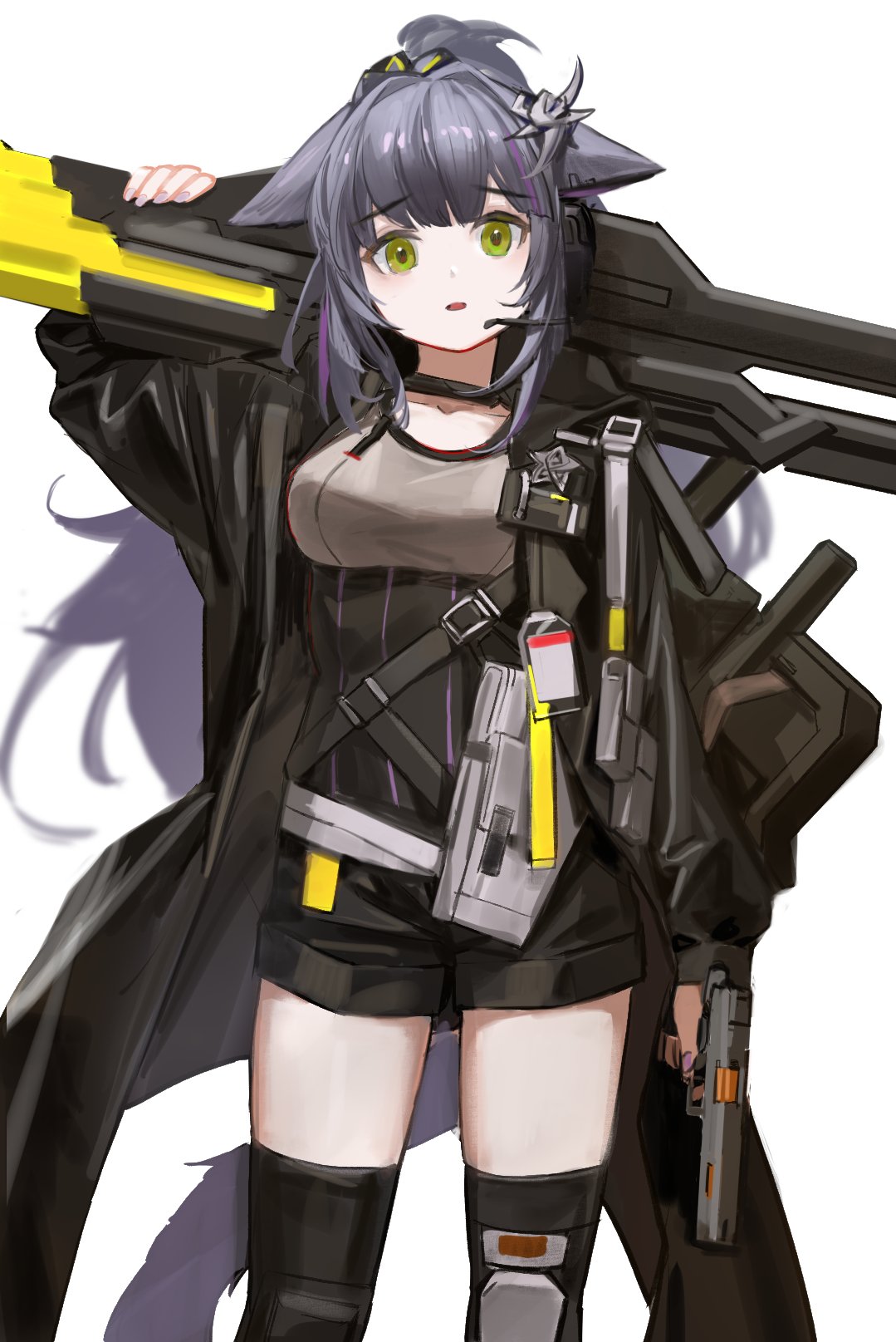 1girl animal_ears arknights black_coat black_shorts black_thighhighs breasts briefcase cat_ears cat_girl cat_tail coat commentary cowboy_shot green_eyes grey_shirt gun handgun highres holding holding_gun holding_weapon id_card jessica_(arknights) jessica_the_liberated_(arknights) kegani_(kegani01) looking_at_viewer medium_breasts multiple_weapons parted_lips purple_hair revolver riot_shield shield shirt shorts simple_background solo tail thighhighs weapon white_background