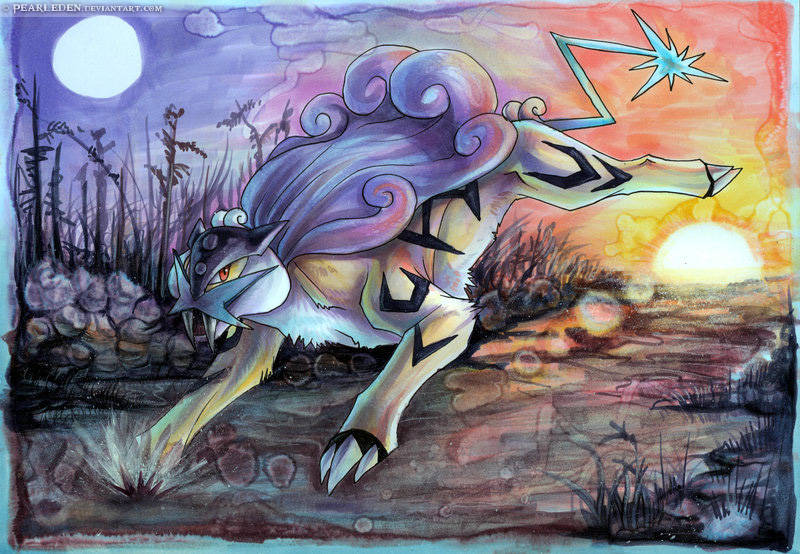 animal animal_focus claws gen_2_pokemon grass legendary_pokemon nintendo novaeden open_mouth pokemon pokemon_(creature) purple_hair raikou red_eyes solo