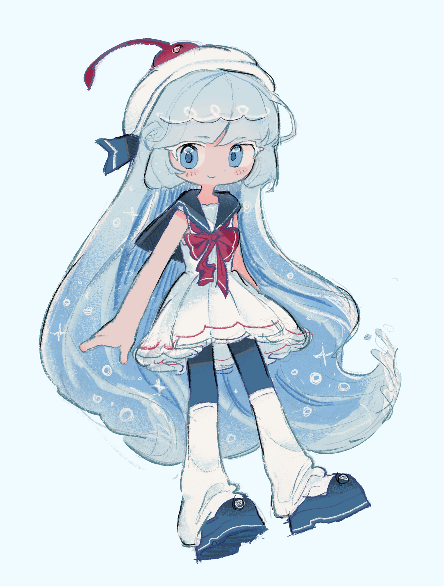 1girl blue_eyes blue_hair blue_pantyhose blue_sailor_collar blush bow bowtie cherry_hat_ornament closed_mouth commentary cookie_run cookie_run:_tower_of_adventures cream_soda_cookie deformed dress english_commentary full_body hat highres humanization leg_warmers liquid_hair long_hair looking_at_viewer pantyhose red_bow red_bowtie sailor_collar shaped_liquid simple_background sleeveless sleeveless_dress smile solo takawoyu very_long_hair white_background white_dress white_hat white_leg_warmers