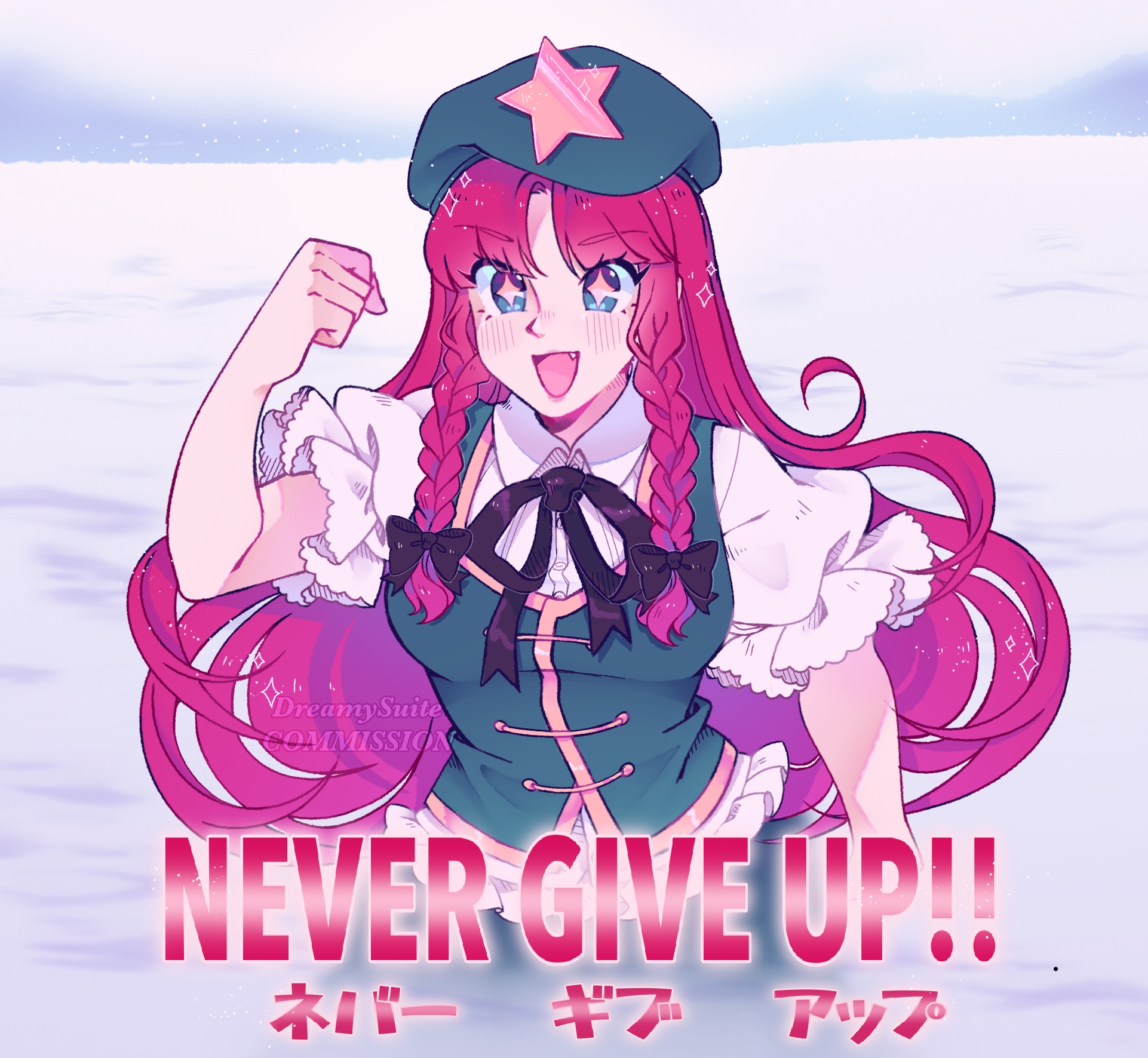 +_+ 1girl artist_name beret black_bow black_ribbon blue_eyes blush bow braid breasts clenched_hand commentary commission dreamysuite english_commentary english_text fang green_vest hair_bow hat hat_ornament highres hong_meiling long_hair looking_at_viewer matsuoka_shuuzou medium_breasts meme neck_ribbon never_give_up!_(meme) open_mouth parted_bangs partially_submerged puffy_short_sleeves puffy_sleeves red_hair ribbon shirt short_sleeves side_braids smile solo star_(symbol) star_hat_ornament touhou twin_braids upper_body very_long_hair vest white_shirt