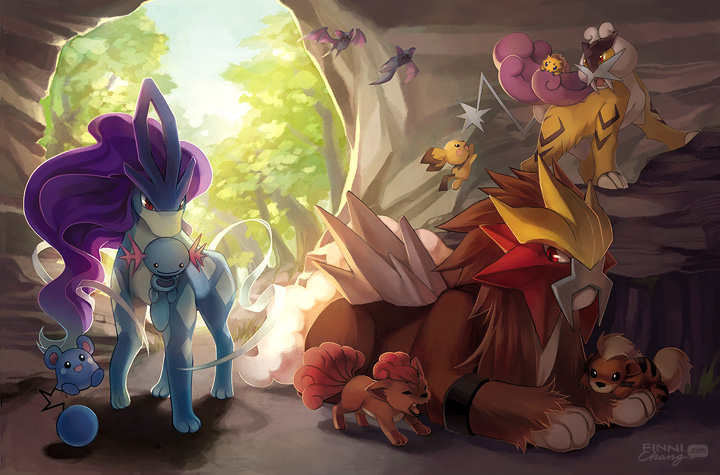 animal_focus azurill entei finni_chang gen_1_pokemon gen_2_pokemon gen_3_pokemon growlithe legendary_pokemon lying mouth_hold nintendo no_humans orange_hair pichu pokemon pokemon_(creature) purple_hair raikou red_eyes signature smile suicune vulpix white_hair wings wooper zubat