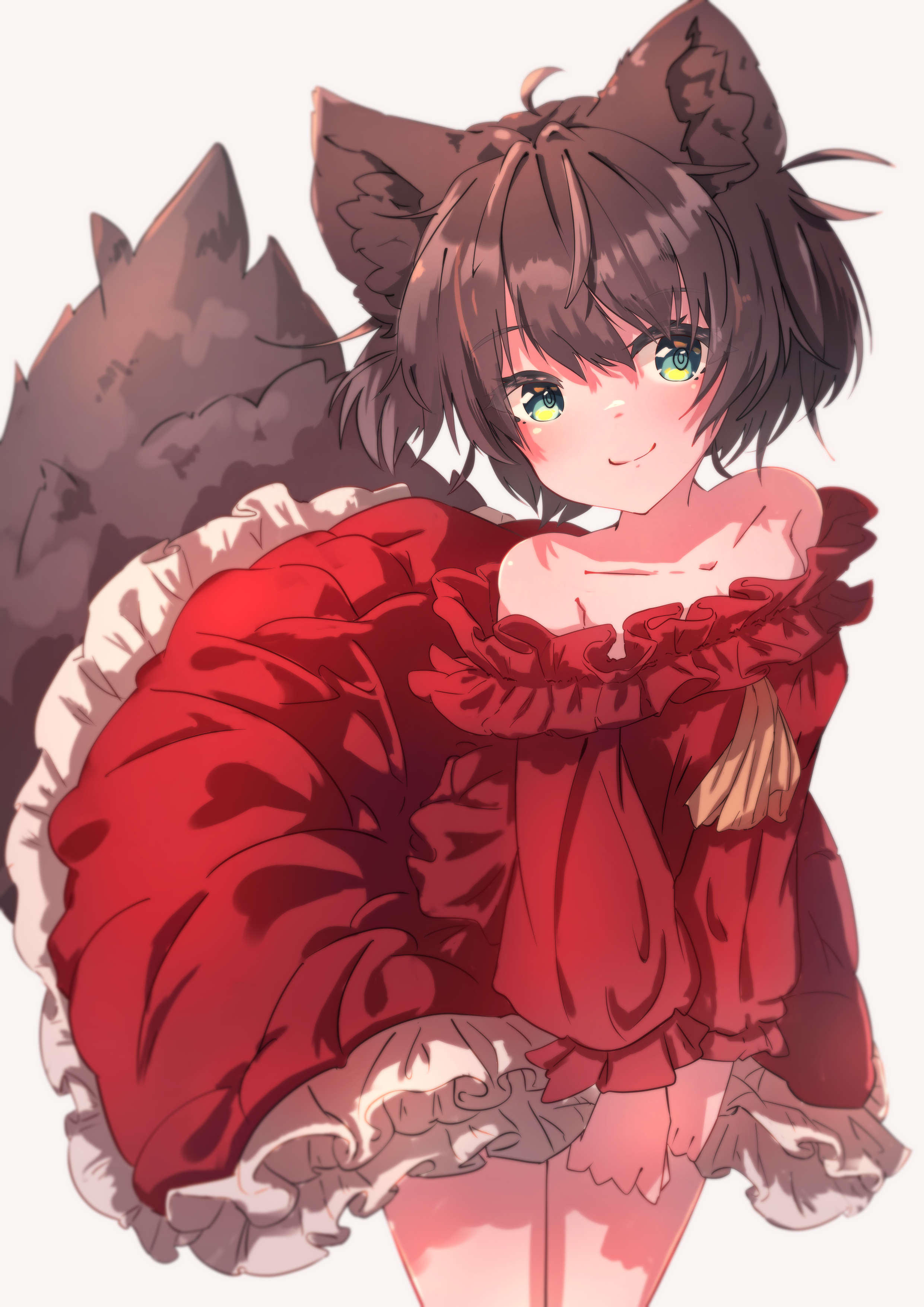 1girl absurdres animal_ears bare_shoulders clothes_lift commentary dress dress_lift fox_ears fox_girl fox_tail frilled_dress frills highres kotatsune leaning_forward lifted_by_tail long_sleeves off-shoulder_dress off_shoulder one_side_up original puffy_long_sleeves puffy_sleeves red_dress short_hair simple_background smile tail white_background