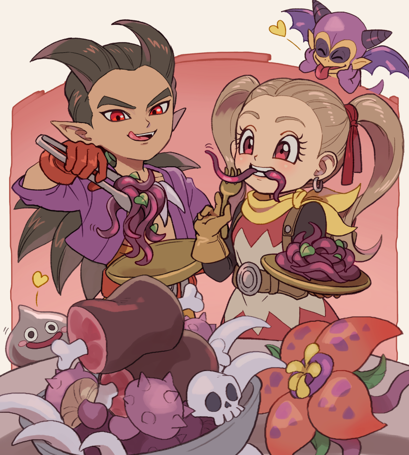 1boy 1girl 2others blonde_hair boned_meat brown_hair commentary_request dated_commentary dragon_quest dragon_quest_builders_2 dress earrings eating female_builder_(dqb2) flower food fork gloves gremlin_(dragon_quest) gurimun_(dqb2) hair_pulled_back hair_ribbon heart holding holding_fork holding_plate holding_tongs hoop_earrings janis_(hainegom) jewelry licking_lips looking_at_food low_ponytail meat metal_slime multiple_others mushroom neckerchief pink_eyes plate ponytail red_eyes ribbon sidoh_(dqb2) skull tongs tongue tongue_out twintails yellow_gloves yellow_neckerchief