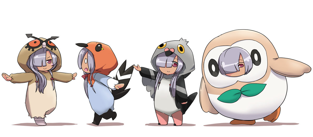 4girls :> clone closed_mouth commentary_request cosplay costume crossover dark-skinned_female dark_skin fletchling fletchling_(cosplay) gen_2_pokemon gen_5_pokemon gen_6_pokemon gen_7_pokemon grey_hair hair_over_one_eye hand_up hoothoot hoothoot_(cosplay) long_hair multiple_girls nintendo o_o open_mouth orange-bird pidove pidove_(cosplay) pokemon red_eyes rowlet rowlet_(cosplay) smile smug standing standing_on_one_leg t-pose tenka_hyakken torikai_rai_kunitsugu walking white_background