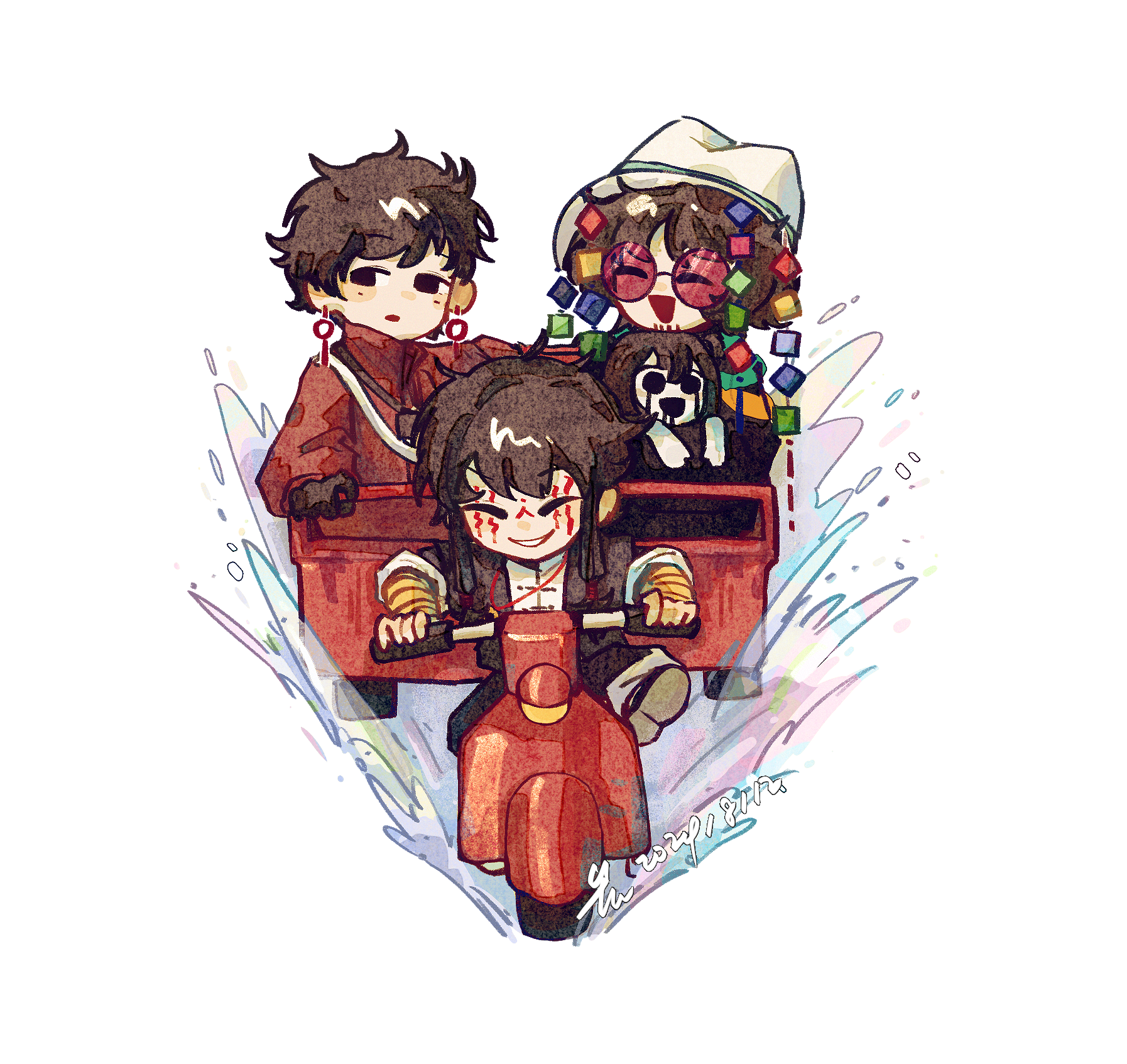 1girl 3boys beard_stubble black_eyes black_gloves black_hair black_jacket black_pants chinese_commentary closed_eyes colored_skin commentary_request dated deformed earrings facial_hair facial_tattoo gloves hat high_collar highres huai_huizhi huai_yunqing jacket jewelry li_yuting_(male) long_sleeves low-tied_sidelocks mole mole_under_each_eye mole_under_eye motorcycle multiple_boys multiple_moles on_motorcycle open_clothes open_jacket open_mouth pants red-tinted_eyewear red_jacket short_hair short_hair_with_long_locks short_twintails sidelocks simple_background sleeves_rolled_up smile stubble tattoo tinted_eyewear touqi_guaitan twintails white_background white_hat white_skin ygclmss ziche_fuzhao