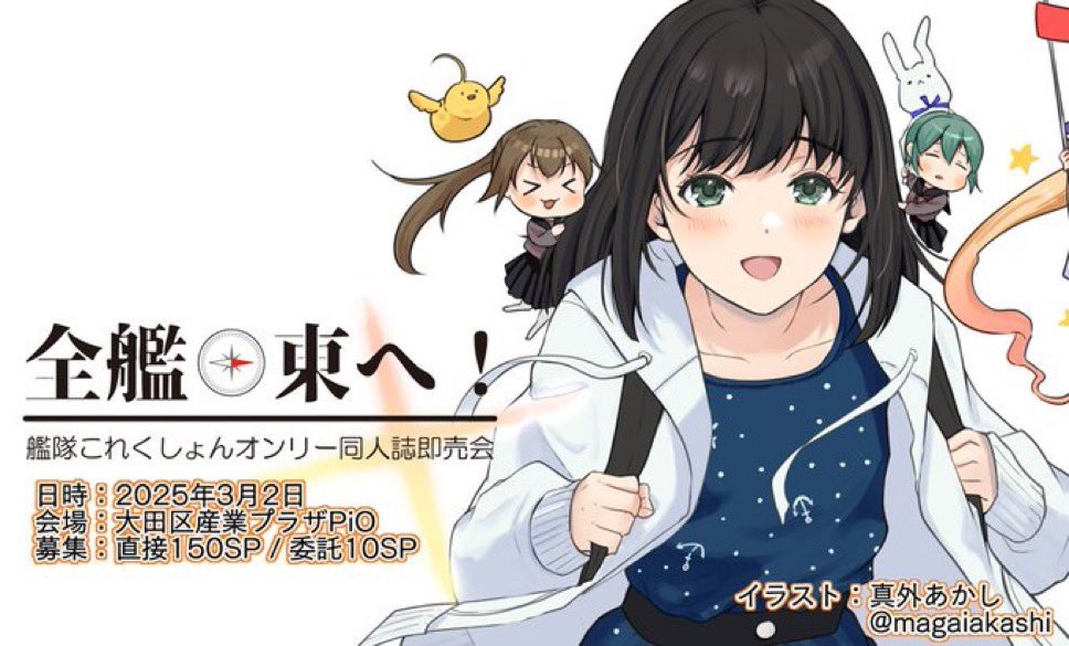 3girls anchor_print backpack bag bird black_hair blue_dress dress fairy_(kancolle) fubuki_(kancolle) fubuki_(spring)_(kancolle) green_eyes hood hooded_jacket jacket kantai_collection magai_akashi medium_hair mini_person minigirl multiple_girls official_alternate_costume official_alternate_hairstyle polka_dot polka_dot_dress rabbit second-party_source smile solo upper_body white_jacket