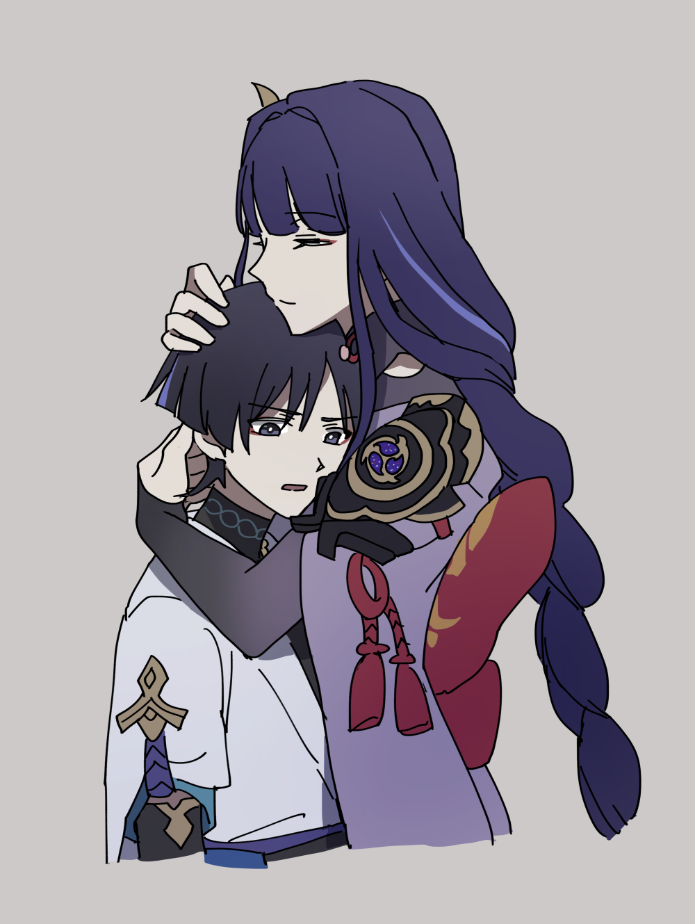 1boy 1girl armor black_bodysuit black_eyes black_hair blunt_bangs blunt_ends bodysuit braid bridal_gauntlets eyeliner eyeshadow genshin_impact hair_intakes hand_in_another's_hair hand_on_another's_head head_on_chest height_difference highres hug japanese_clothes kimono long_hair low-braided_long_hair low-tied_long_hair makeup mandarin_collar mother_and_child mother_and_son multicolored_hair obi parent_and_child parted_lips purple_hair purple_kimono purple_sleeves raiden_shogun red_eyeliner red_eyeshadow red_rope rope sash scaramouche_(genshin_impact) short_sleeves shoulder_armor shrug_(clothing) squinting streaked_hair tassel udeudede upper_body wanderer_(genshin_impact) white_background white_kimono white_sleeves wide_sleeves