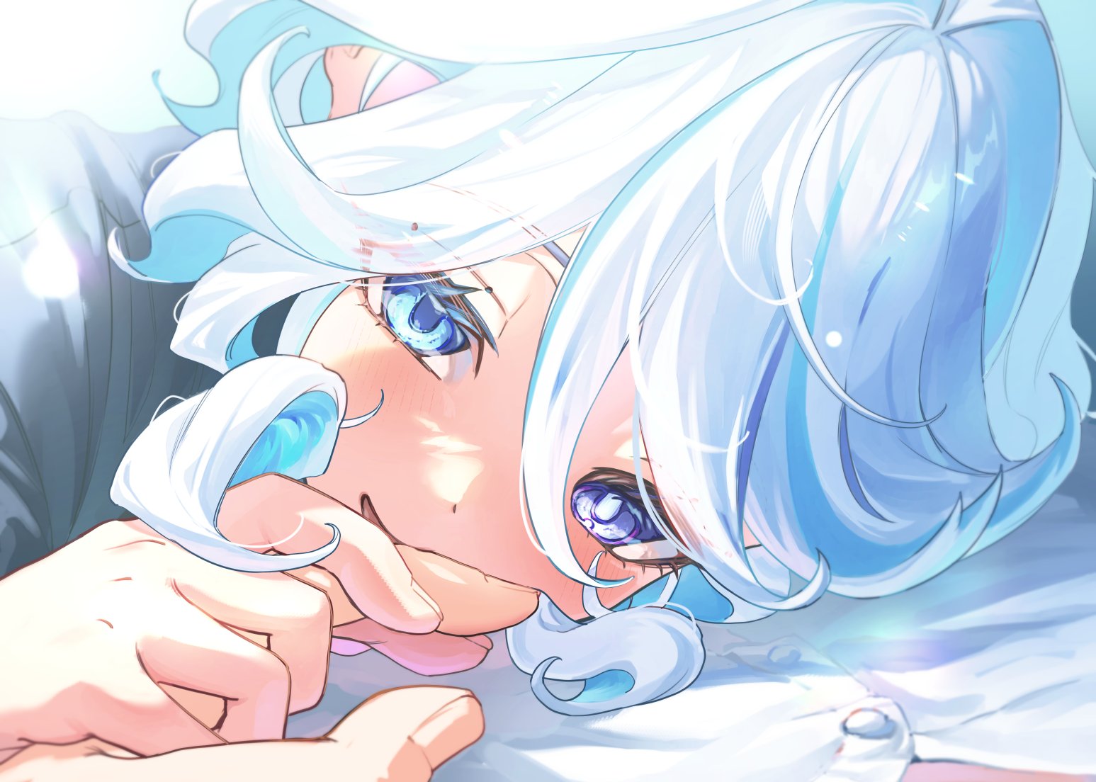 1girl blue_eyes blue_hair buttons eyelashes furina_(genshin_impact) genshin_impact harukiryo head_on_chest looking_at_viewer multicolored_hair open_mouth pov pov_hands shirt sidelocks smile streaked_hair wavy_hair white_hair white_shirt