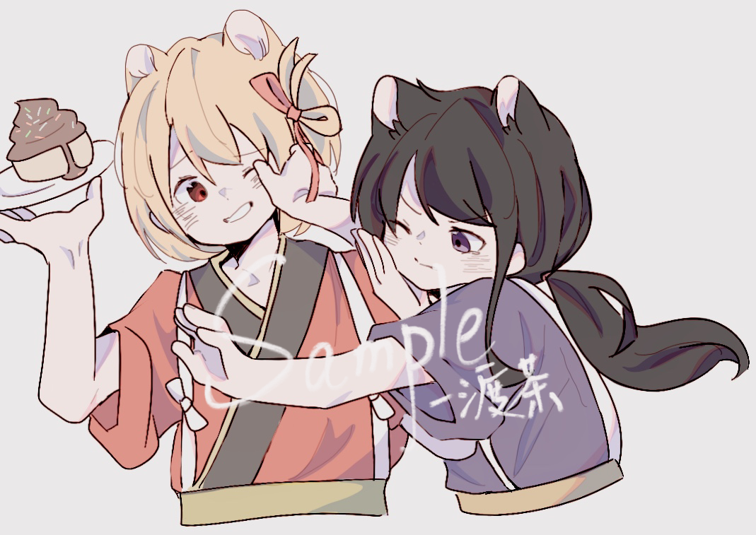2girls alternate_costume animal_ears bare_arms black_hair blonde_hair bow cat_ears chocolate_icing closed_mouth collarbone cropped_torso desert dot_nose eyelashes fighting frown grabbing_another's_hair grey_background grin hair_ribbon hair_rings hand_on_another's_cheek hand_on_another's_face holding holding_another's_hair holding_plate icing inoue_takina japanese_clothes kemonomimi_mode kimono light_blush long_hair low_ponytail lycoris_recoil multiple_girls nishikigi_chisato one_eye_closed ou'er_yiducha outstretched_arm plate ponytail purple_eyes purple_kimono raised_eyebrow red_eyes red_kimono red_ribbon ribbon sample_watermark short_hair short_sleeves sidelocks simple_background single_hair_ring smile sprinkles tearing_up v-shaped_eyebrows very_long_hair watermark white_bow