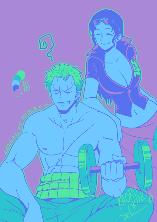 1boy 1girl ? ^_^ breasts cleavage closed_eyes commentary cropped_jacket dumbbell earrings english_commentary eyewear_on_head green_hair green_kimono hair_slicked_back haramaki holding holding_dumbbell japanese_clothes jewelry kimono nico_robin one_eye_closed one_piece pink_sarong purple_background roronoa_zoro sarong scar scar_on_face sidelocks sitting smile stitched_torso stitches suguskao tumblr_username
