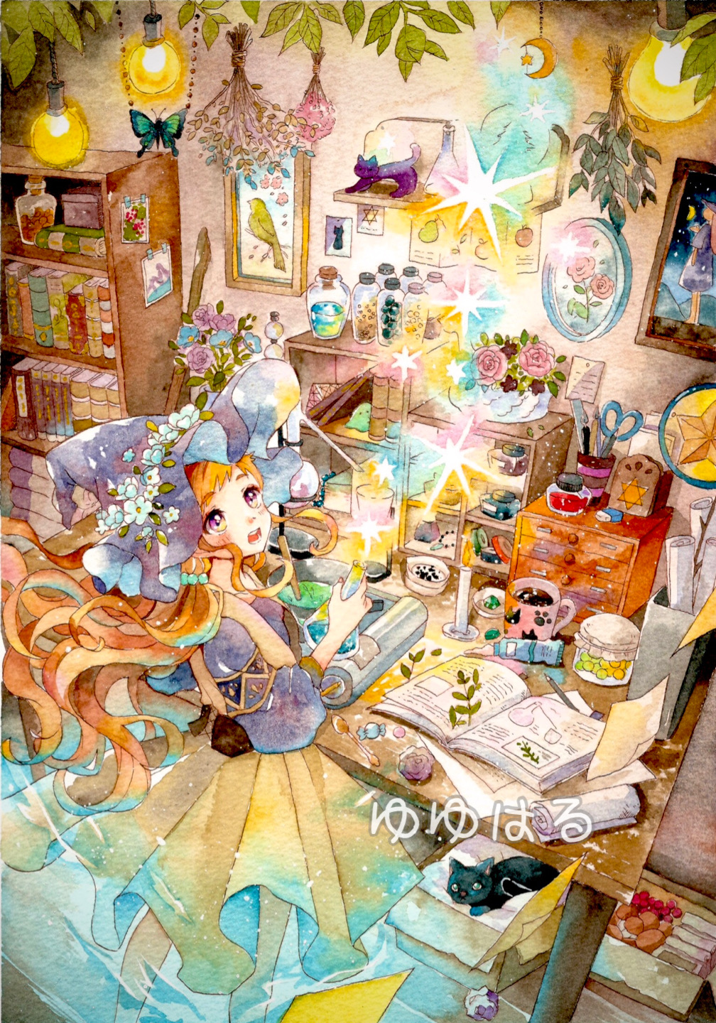 1girl artist_name bird blue_flower blue_hat blue_shirt book bookshelf box breasts bug butterfly candle candy cardboard_box cat flower flower_request food green_bird hat hat_flower hexagram highres holding_potion indoors insect leaf long_hair long_sleeves open_book open_mouth orange_hair original painting_(medium) painting_(object) paper picture_frame pink_flower pink_rose potion purple_eyes purple_flower purple_rose rose scissors shirt skirt small_breasts solo sparkle standing star_of_david table teeth traditional_media watercolor_(medium) watermark wavy_hair witch witch_hat yellow_skirt yuyuharu_1027