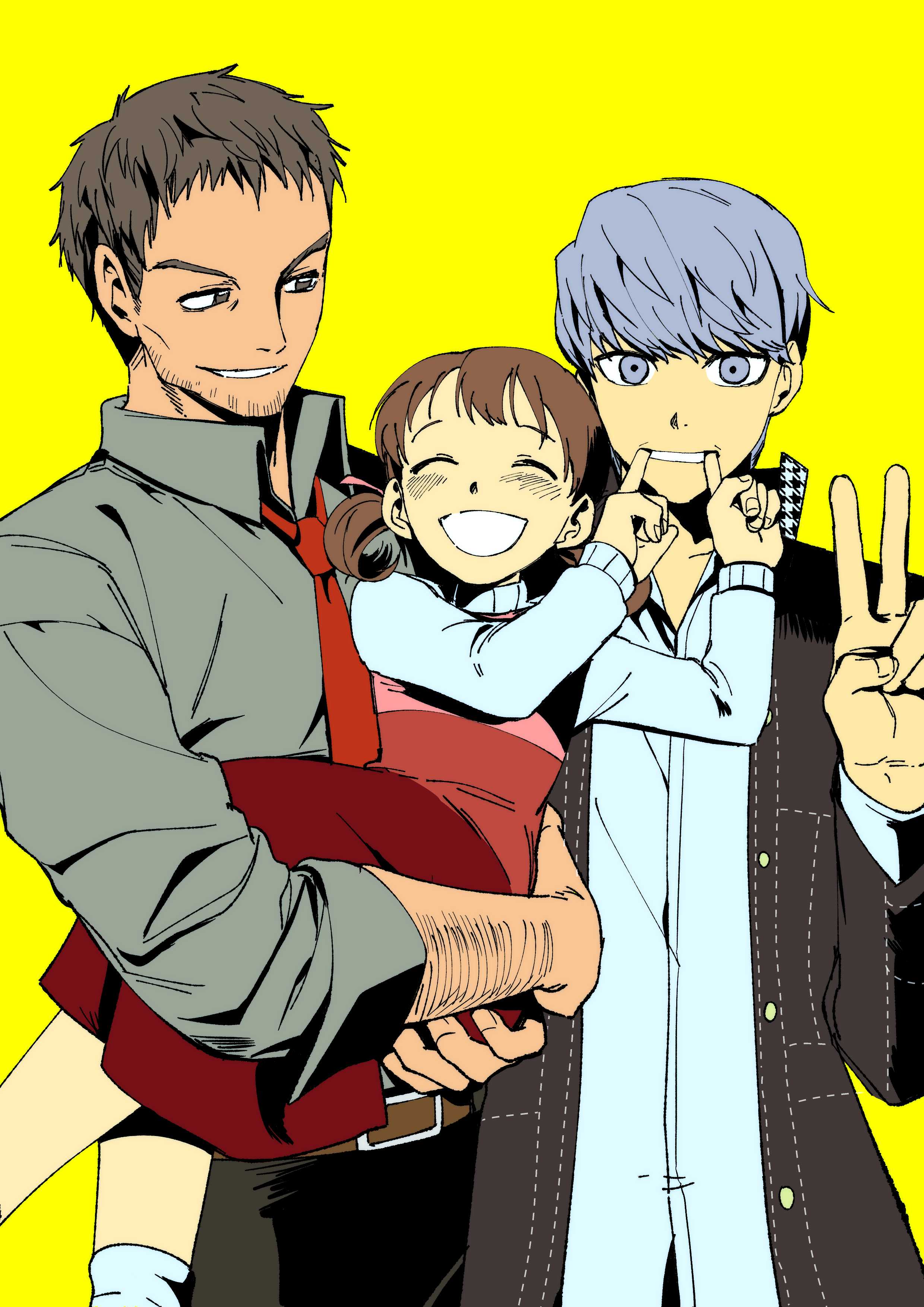 1girl 2boys absurdres arm_hair babakun brown_eyes brown_hair child closed_eyes doujima_nanako doujima_ryoutarou dress facial_hair father_and_child father_and_daughter forced_smile grey_eyes grey_hair grey_shirt highres jacket looking_at_another looking_at_viewer multiple_boys narukami_yu necktie open_mouth parent_and_child persona persona_4 red_necktie school_uniform shirt short_hair short_twintails smile stubble sweater turtleneck turtleneck_sweater twintails v yasogami_school_uniform yellow_background