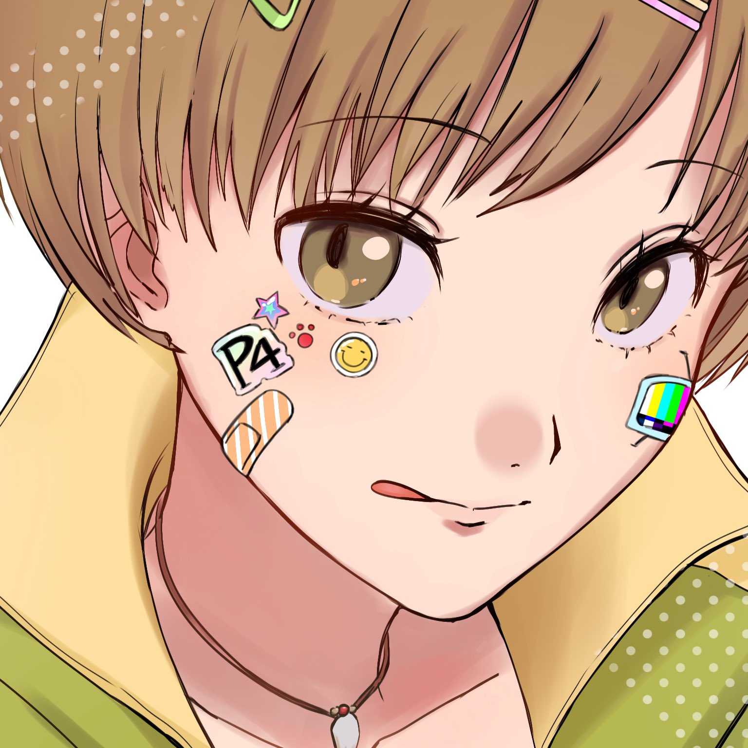 1girl bandaid bandaid_on_cheek bandaid_on_face brown_eyes brown_hair choker close-up closed_mouth collarbone facial_mark green_jacket hair_ornament hairclip highres jacket looking_at_viewer persona persona_4 popped_collar portrait satonaka_chie short_hair smile solo star_(symbol) star_facial_mark tongue tongue_out upper_body usa_(kawaii_152cm)