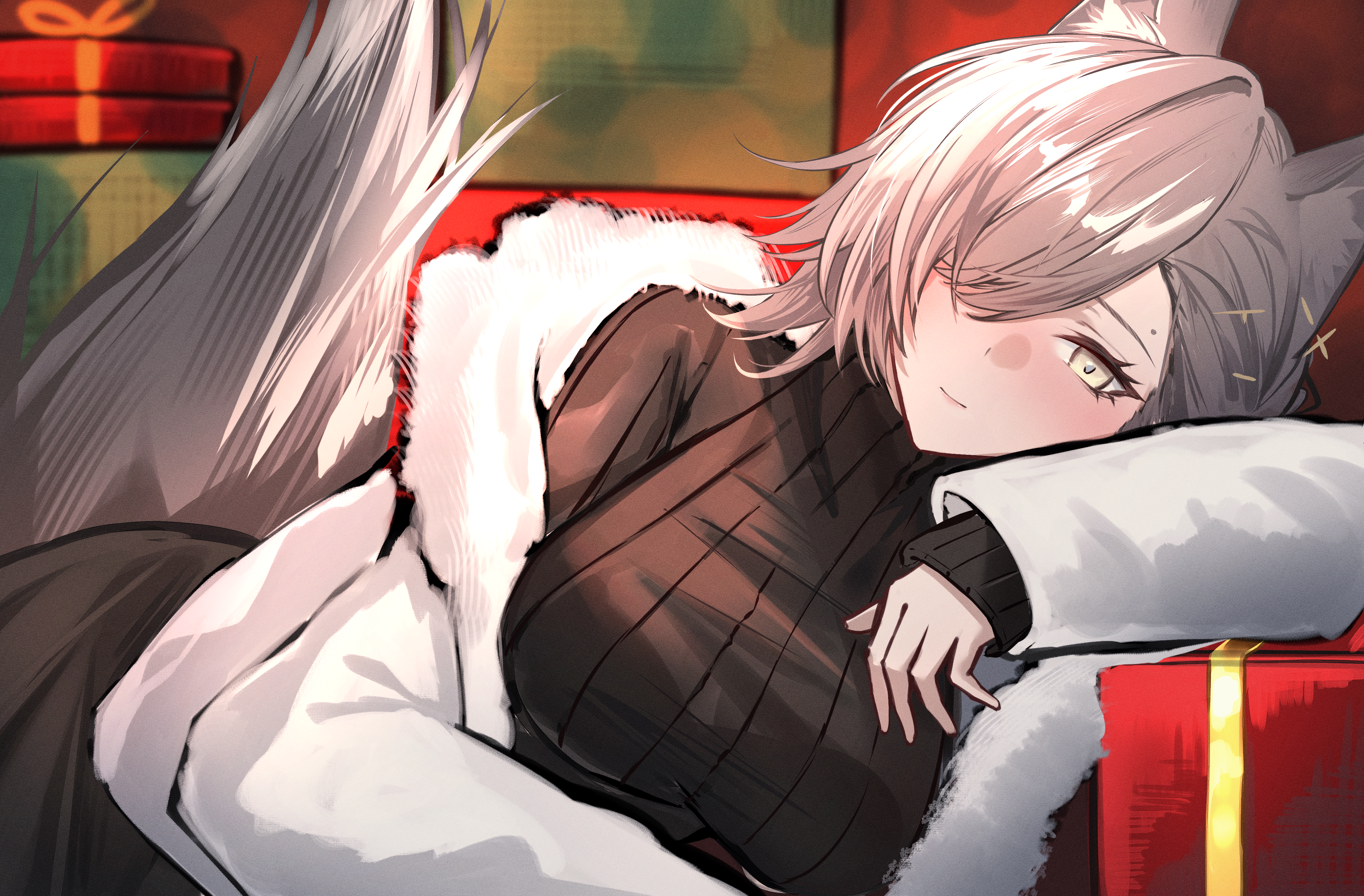 1girl absurdres animal_ear_fluff animal_ears arknights black_skirt black_sweater box closed_mouth fur-trimmed_jacket fur_trim gift gift_box grey_hair hair_over_one_eye highres jacket long_hair long_sleeves looking_at_viewer mo_komo_momo mole mole_above_eye official_alternate_costume open_clothes open_jacket penance_(arknights) penance_(occasionally_flushed)_(arknights) skirt smile solo sweater tail turtleneck turtleneck_sweater white_jacket wolf_ears wolf_girl wolf_tail yellow_eyes