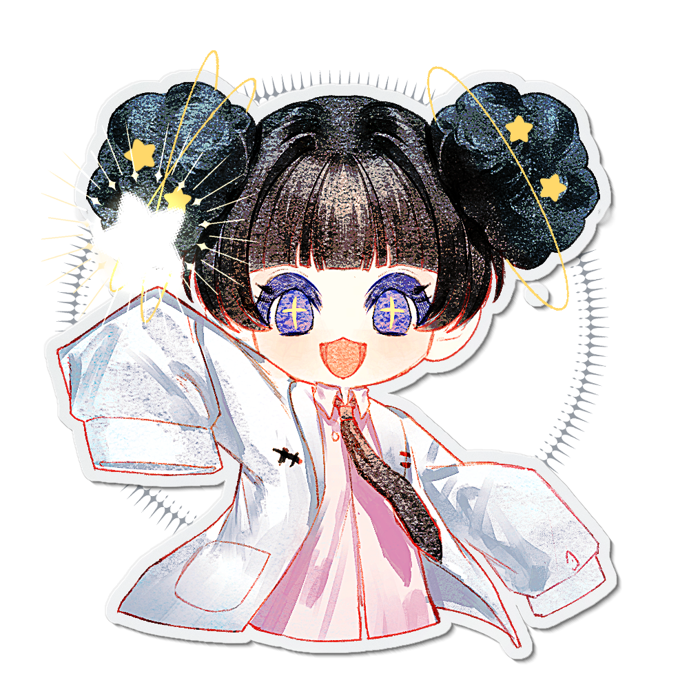 1girl :3 afro_puffs artist_request black_hair black_necktie chinese_commentary collared_shirt commentary_request commission cosplay cropped_torso deformed lab_coat long_sleeves mo_chengwei mo_chengwei_(cosplay) necktie open_clothes open_mouth pink_shirt purple_eyes second-party_source shirt short_hair sleeves_past_fingers sleeves_past_wrists smile solo star_(symbol) tong_lingshen touqi_guaitan transparent_background