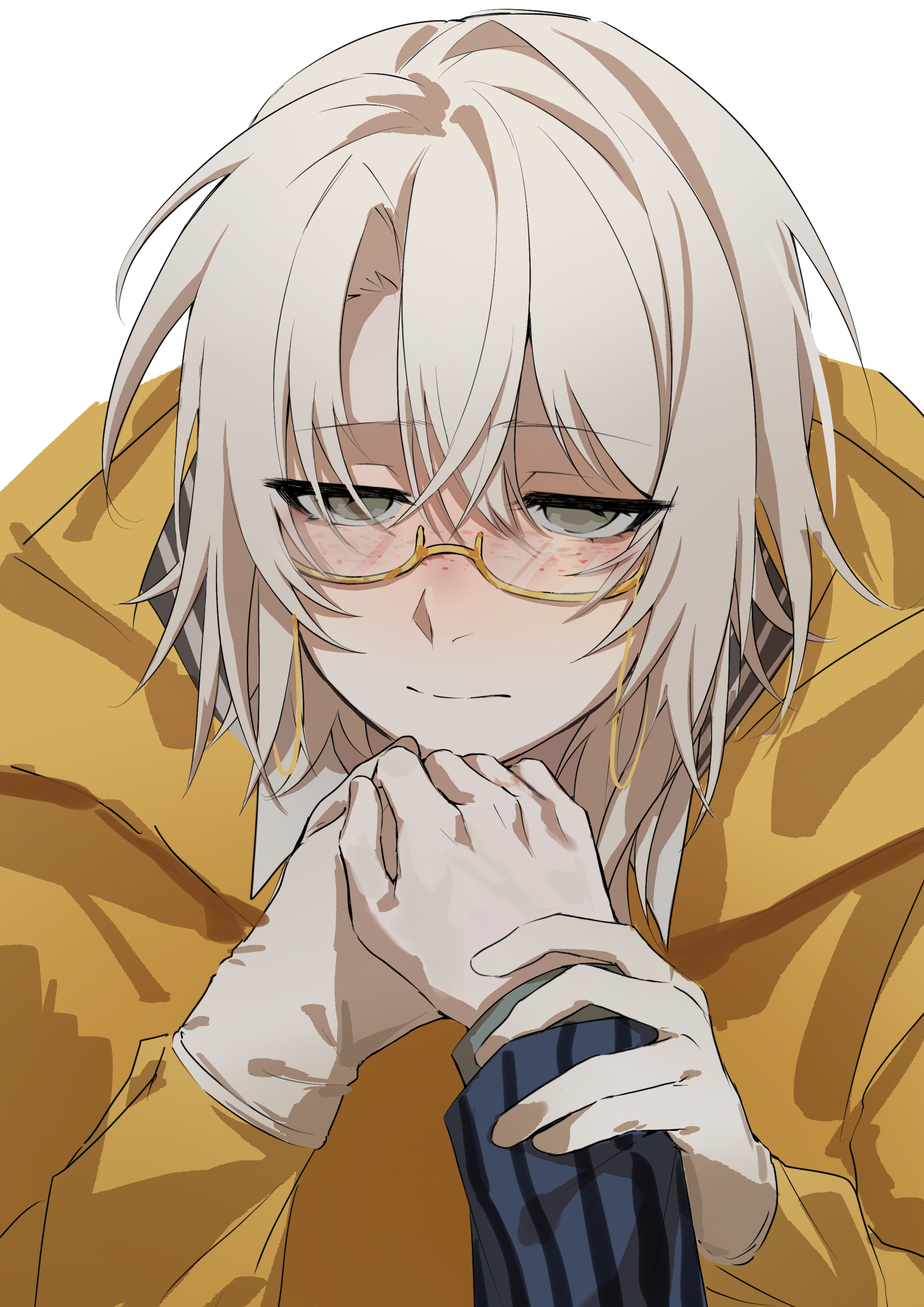 0260767818 2boys absurdres bai_ling_(touqi_guaitan) blue_shirt blush chinese_commentary commentary_request eyewear_strap freckles glasses gloves hair_between_eyes hand_on_another's_wrist highres jacket liu_qingcheng long_sleeves male_focus medium_hair multiple_boys rectangular_eyewear semi-rimless_eyewear shirt simple_background solo_focus striped_clothes striped_shirt touqi_guaitan vertical-striped_clothes vertical-striped_shirt white_background white_gloves white_hair white_shirt yaoi yellow-framed_eyewear yellow_eyes yellow_jacket