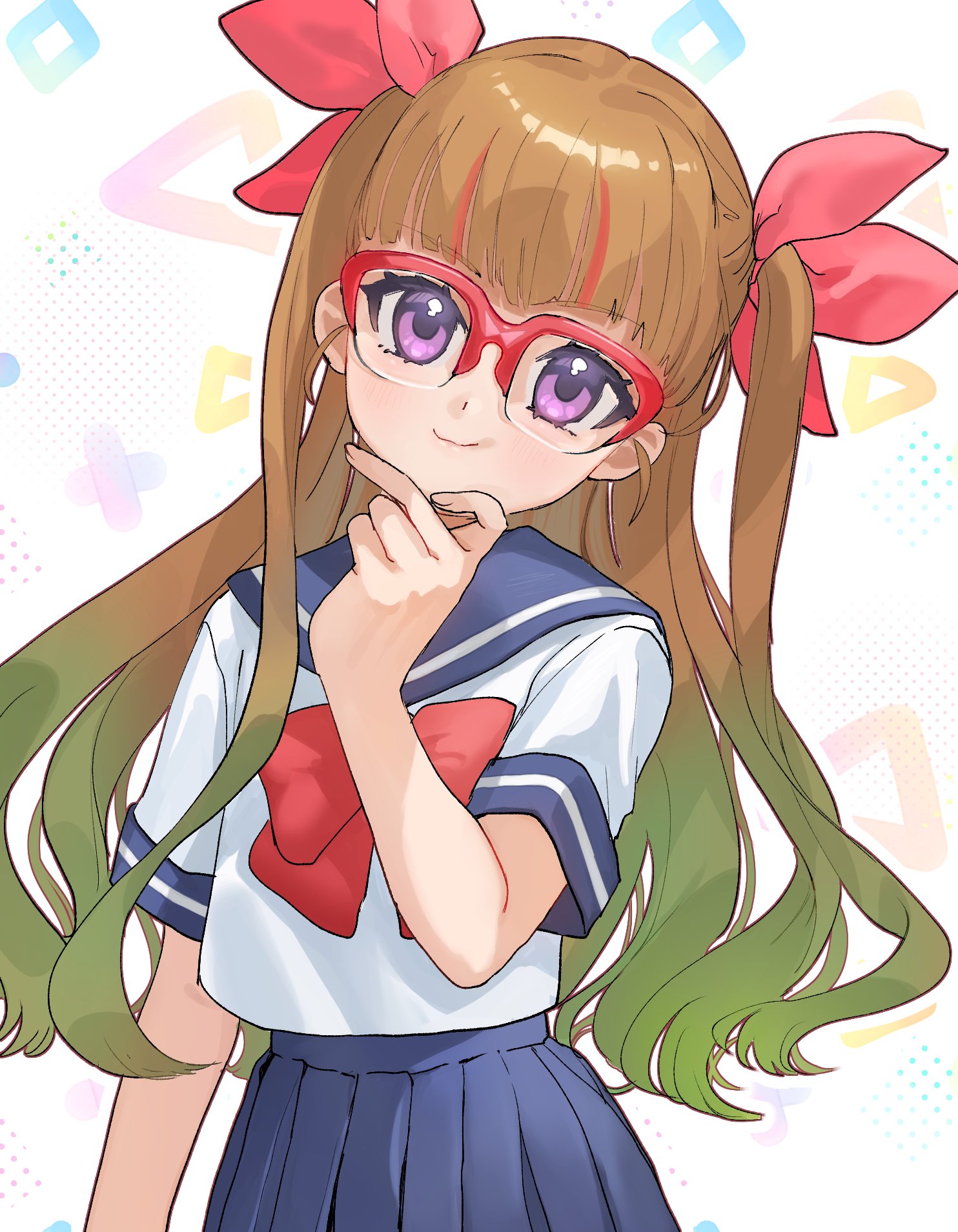 1girl blue_skirt bow brown_hair glasses gradient_hair hair_bow hand_on_own_chin highres long_hair looking_at_viewer multicolored_hair ohdo_yuamu pleated_skirt purple_eyes red-framed_eyewear red_bow school_uniform serafuku shirt simple_background skirt smile white_shirt yu-gi-oh! yu-gi-oh!_go_rush!! yuzutaroman