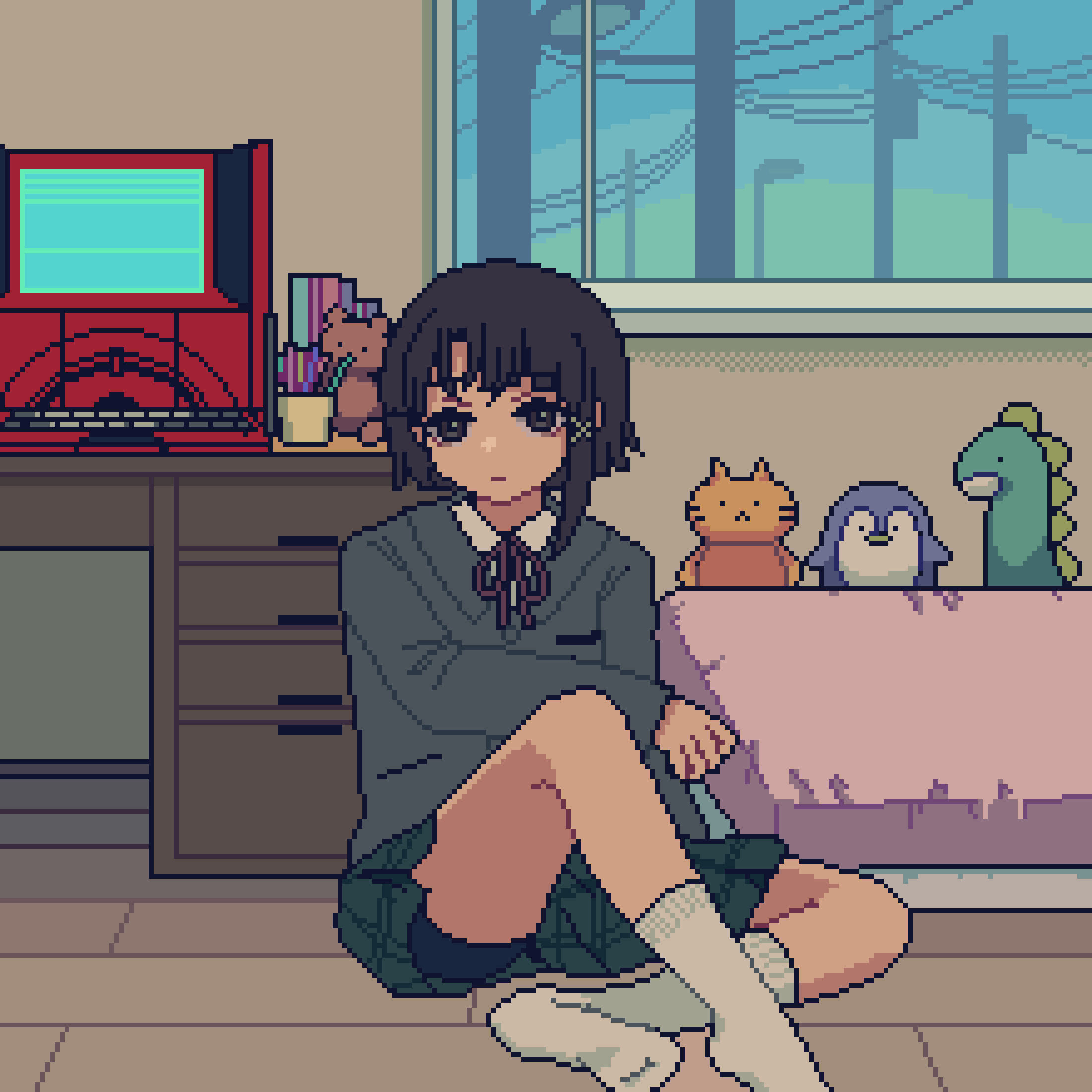 1girl asymmetrical_hair bed blazer blue_sky brown_eyes brown_hair closed_mouth commentary_request computer cup desk drinking_straw expressionless floor full_body green_skirt green_sky grey_jacket hair_ornament hairclip highres indoors iwakura_lain jacket long_sleeves looking_at_viewer monitor nanami_yuki_(yuki77mi) neck_ribbon official_art on_floor pixel_art plaid_clothes plaid_skirt power_lines red_ribbon ribbon school_uniform second-party_source serial_experiments_lain shirt short_hair single_sidelock sitting skirt sky socks solo stuffed_animal stuffed_cat stuffed_dinosaur stuffed_penguin stuffed_toy teddy_bear utility_pole white_shirt white_skirt white_socks window wooden_floor x_hair_ornament
