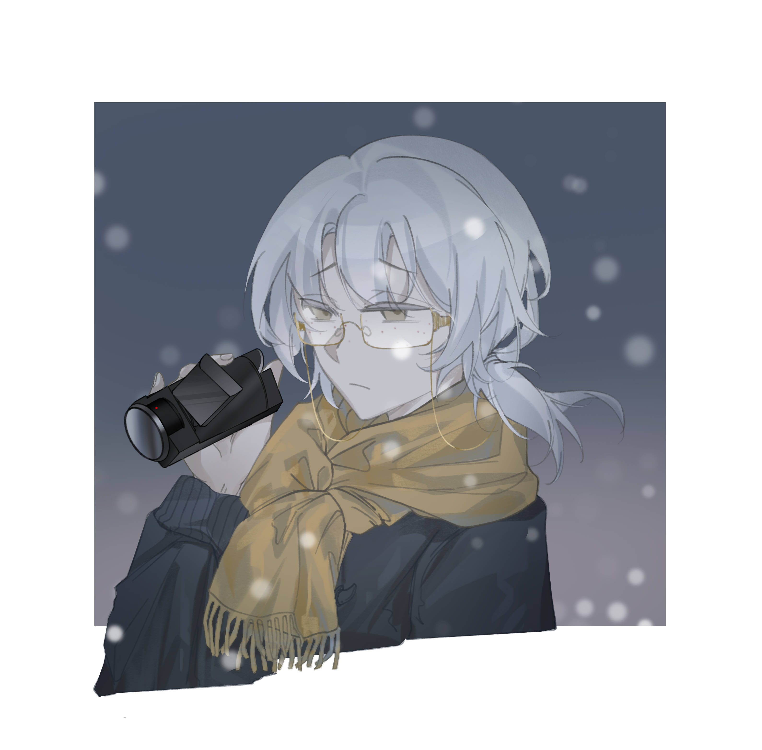1boy absurdres bai_ling_(touqi_guaitan) black_jacket camera chinese_commentary closed_mouth colored_eyelashes commentary_request eyewear_strap freckles glasses hair_between_eyes highres holding holding_camera jacket kunlou long_sleeves male_focus medium_hair rectangular_eyewear scarf semi-rimless_eyewear solo touqi_guaitan white_hair yellow-framed_eyewear yellow_eyes yellow_scarf