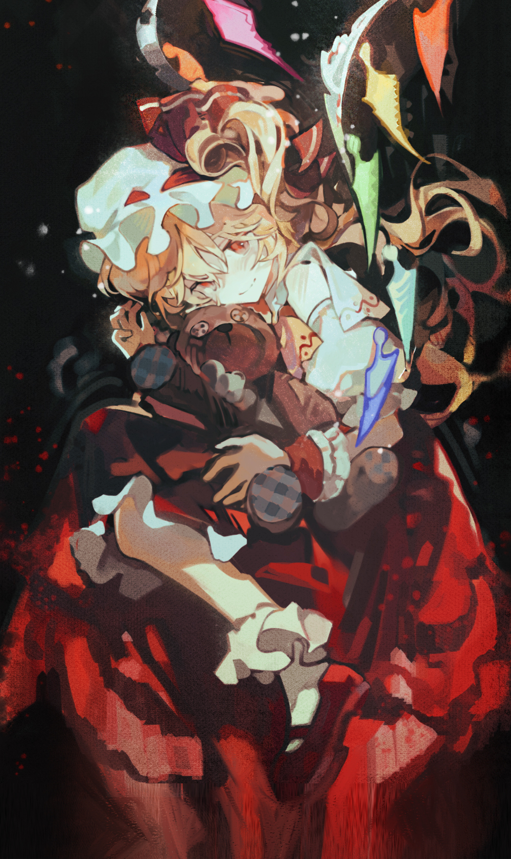 1girl artist_request ascot blonde_hair closed_mouth commentary_request crystal flandre_scarlet frilled_skirt frills full_body hat hat_ribbon highres hugging_object long_hair looking_at_viewer mary_janes puffy_short_sleeves puffy_sleeves red_eyes red_shoes red_skirt red_vest ribbon shirt shoes short_sleeves side_ponytail skirt smile socks solo stuffed_animal stuffed_toy teddy_bear touhou user_wndh2753 vest white_shirt white_socks wings wrist_cuffs yellow_ascot