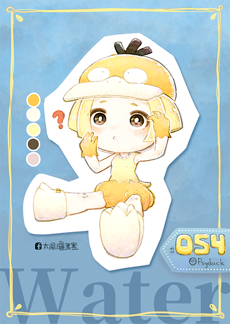 1girl ? blonde_hair blue_background bright_pupils brown_eyes character_hat character_name chibi chibi_only chiuanzhang color_guide facebook_username full_body gen_1_pokemon nintendo orange_shorts personification pokemon psyduck shirt shorts sitting solo white_footwear white_pupils yellow_shirt